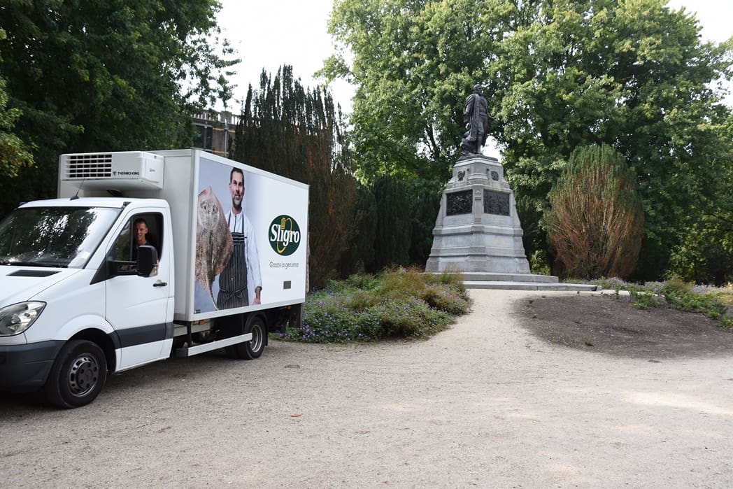 Klokslag half twaalf komt de Sligro met twee wagens aanrijden.