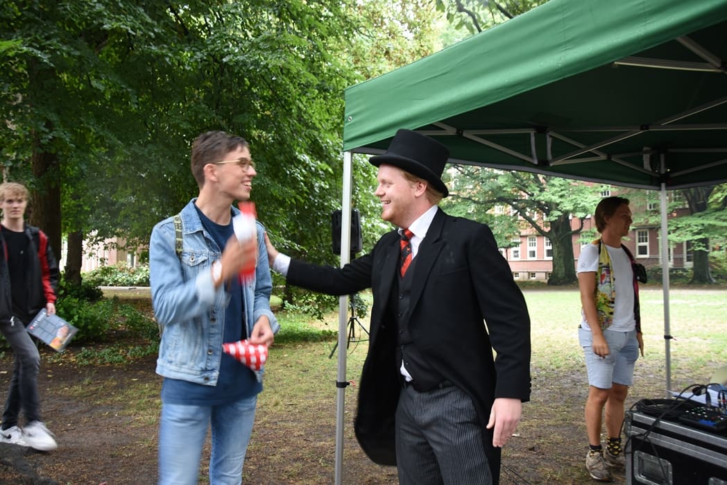 Verschillende Commissieleden stonden achter de merchandisekraam of knoopten gesprekken aan met de eerstejaars.