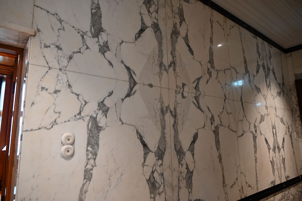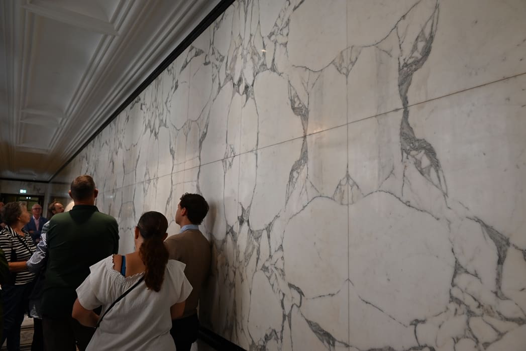 Dat marmer is nog een verhaal apart. Wie goed oplet ziet dat alle afbeeldingen gespiegeld zijn. Er zijn dus destijds platen doormidden gezaagd en zeg maar uitgeklapt gemonteerd.