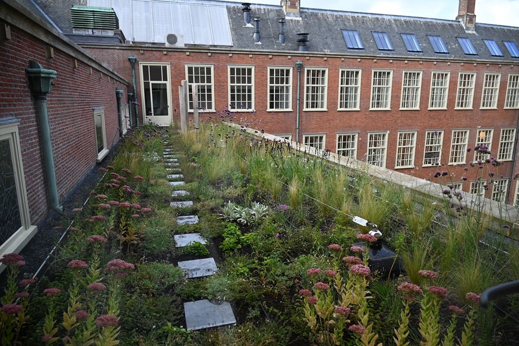 De daken zijn vergroend en op andere daken zijn zonnepanelen geplaatst.