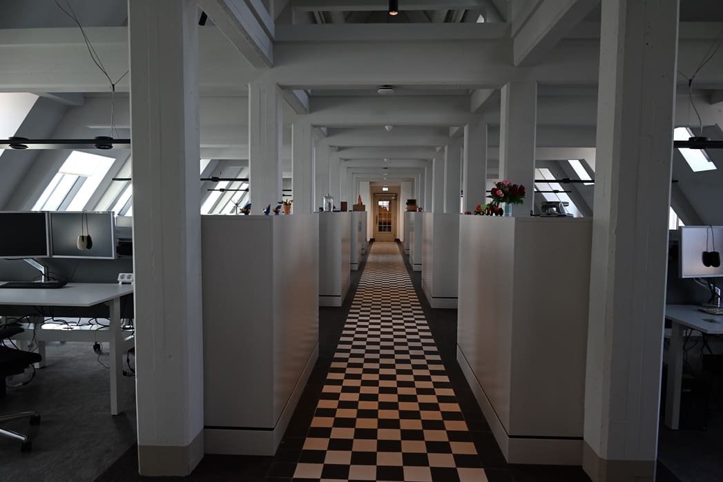 Overal zijn flexwerkplekken met in hoogte verstelbare bureaus. Iedereen heeft een tablet die aan te sluiten is op alle beeldschermen waar dan ook in alle werkruimtes.