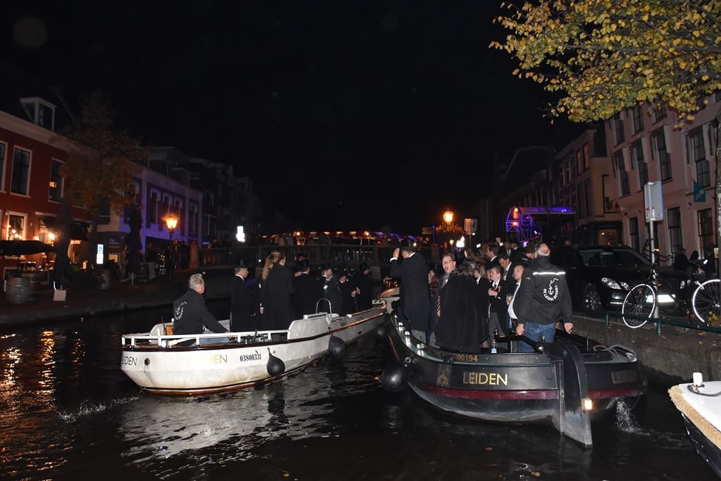 Het bestuur en commissieleden van de 3 October Vereeniging en onder andere de besturen van Alkmaar en Groningen voeren met een aantal boten van de Leidse Rederij naar de Zijlpoort.