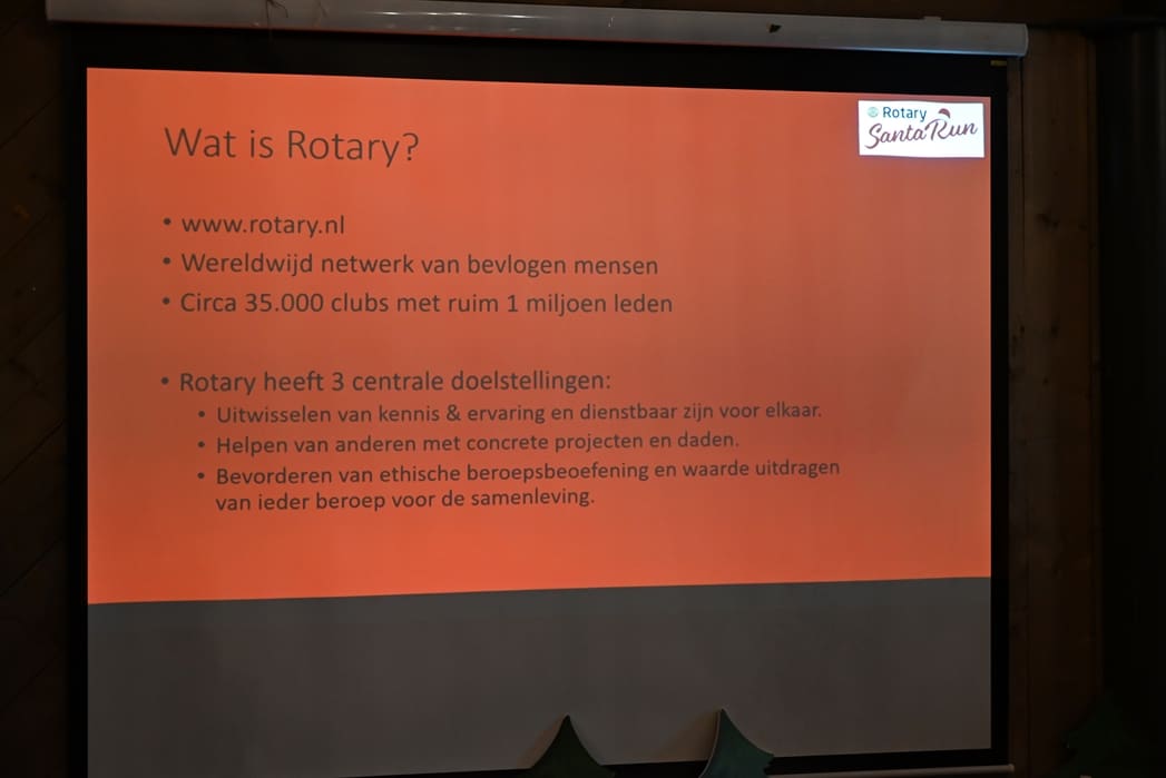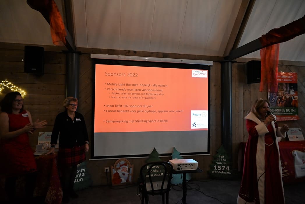 Tijdens de sponsorborrel van de Rotary Santa Run zat de stemming om er een geweldig evenement van te maken er helemaal in. De borrel was bedoeld om de sponsors bij te praten en te bedanken. Ook werden de goede doelen voorgesteld en waren er vertegenwoordigers van die organisaties aanwezig om eventueel uitleg over hun werk te geven. Bij binnenkomst kon je niet om de kerstsfeer heen.