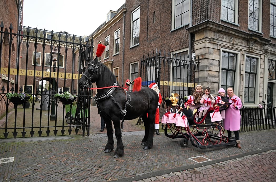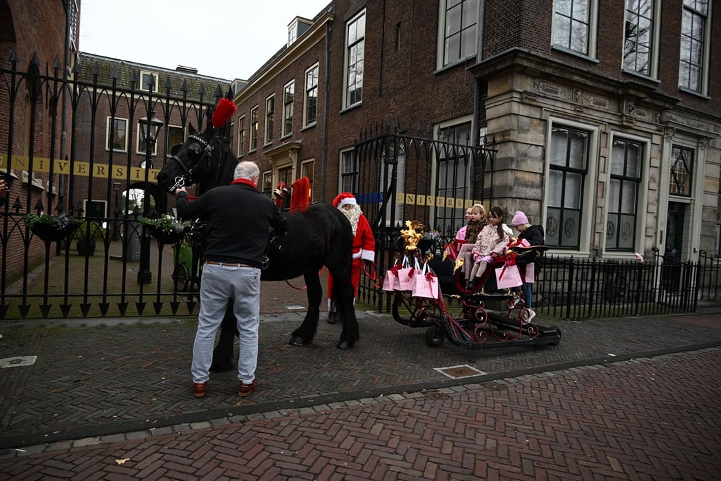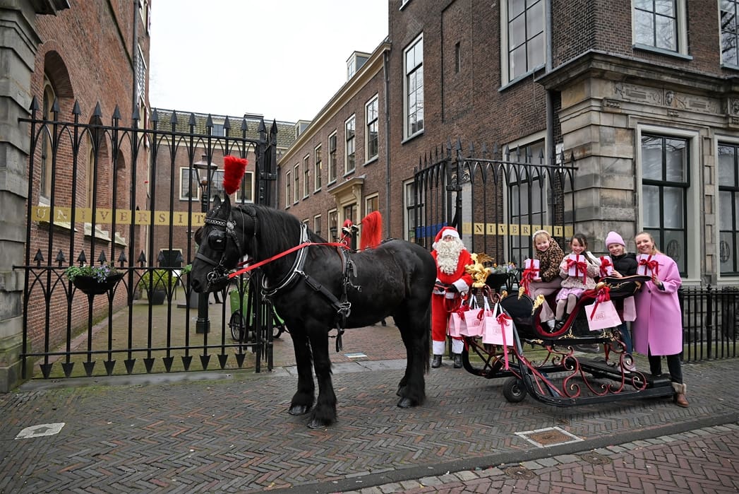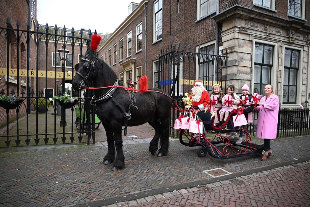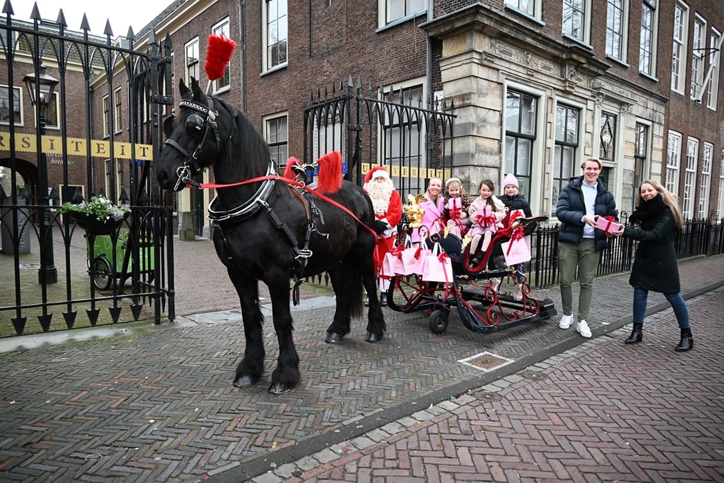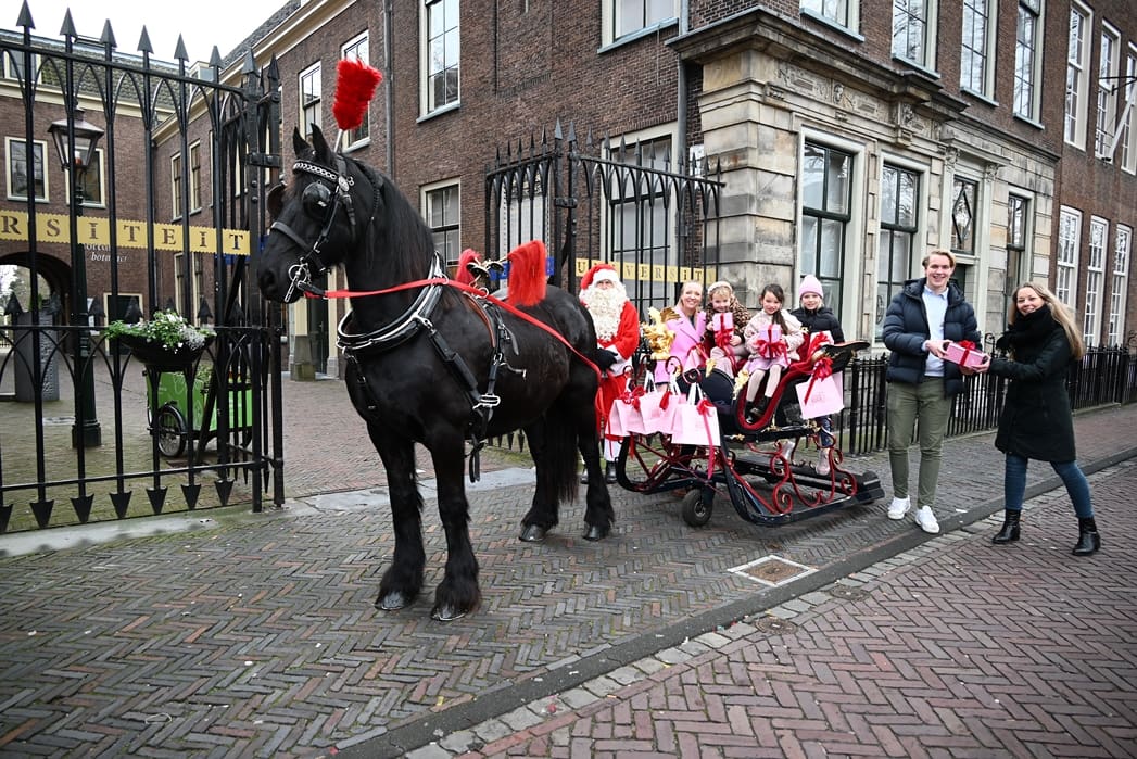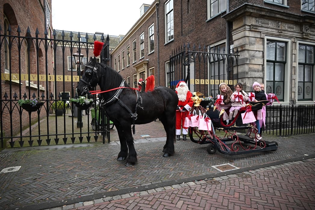 Een organisatie waarbij hij in elk geval in het pakket te vinden is, dat is de universiteit. Anton en Olivier Verschelling wilden de bestelling op een leuke manier bij de universiteit afleveren. Dan kom je in deze tijd van het jaar al snel bij een arrenslee terecht, alleen makkelijker gezegd dan gedaan. Toch stond er gisteren een arrenslee op de Beestenmarkt.