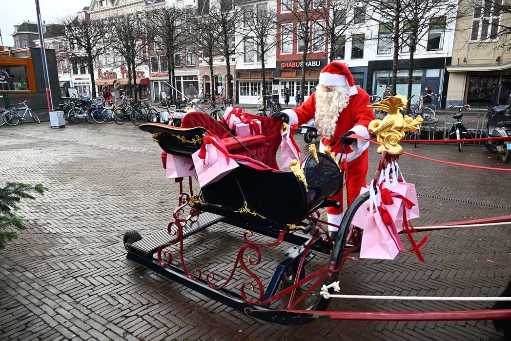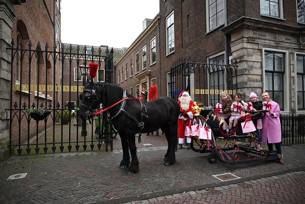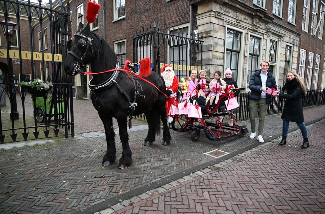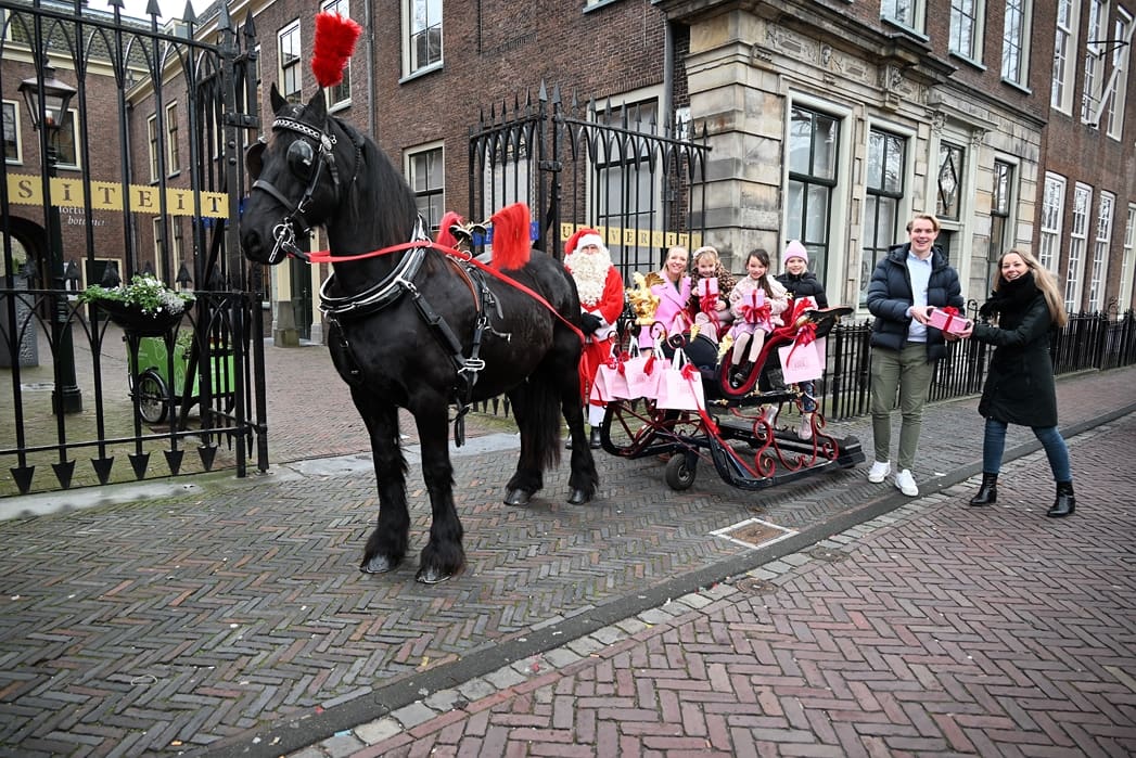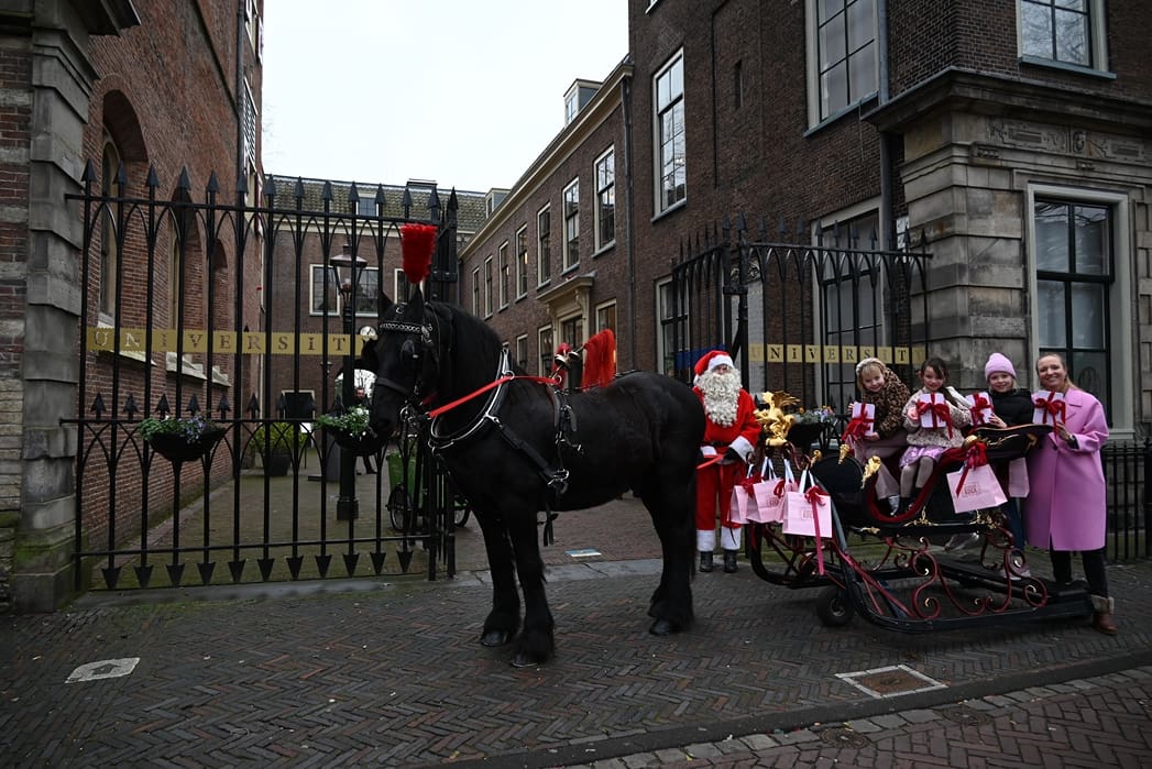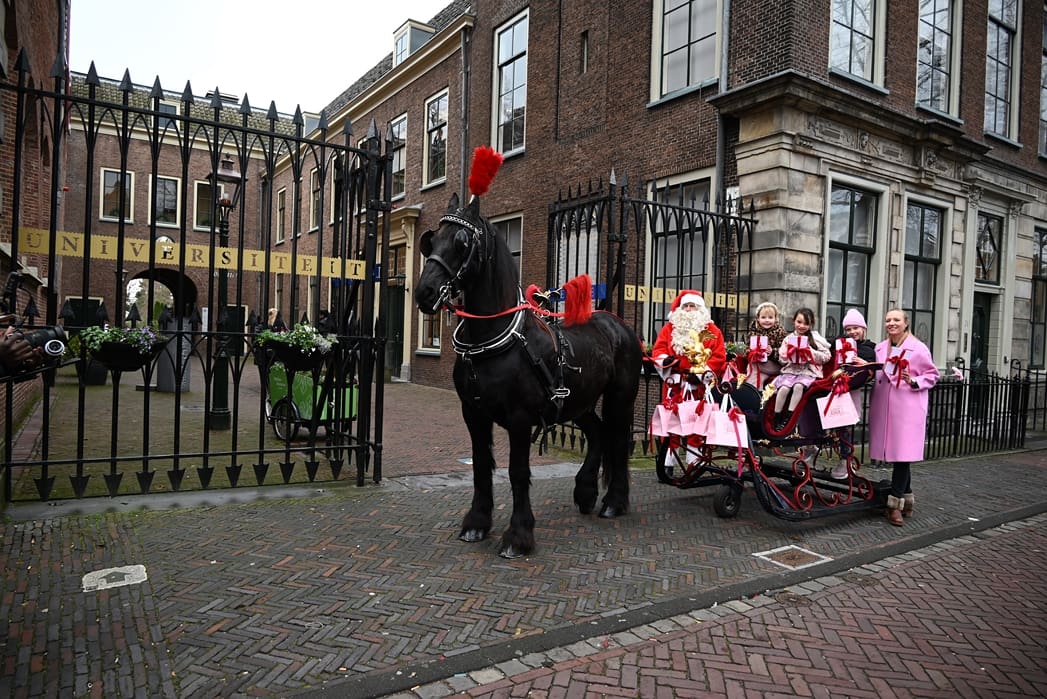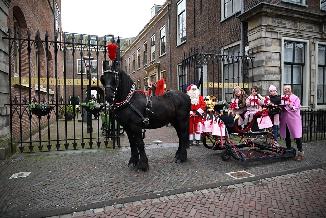 Een organisatie waarbij hij in elk geval in het pakket te vinden is, dat is de universiteit. Anton en Olivier Verschelling wilden de bestelling op een leuke manier bij de universiteit afleveren. Dan kom je in deze tijd van het jaar al snel bij een arrenslee terecht, alleen makkelijker gezegd dan gedaan. Toch stond er gisteren een arrenslee op de Beestenmarkt.