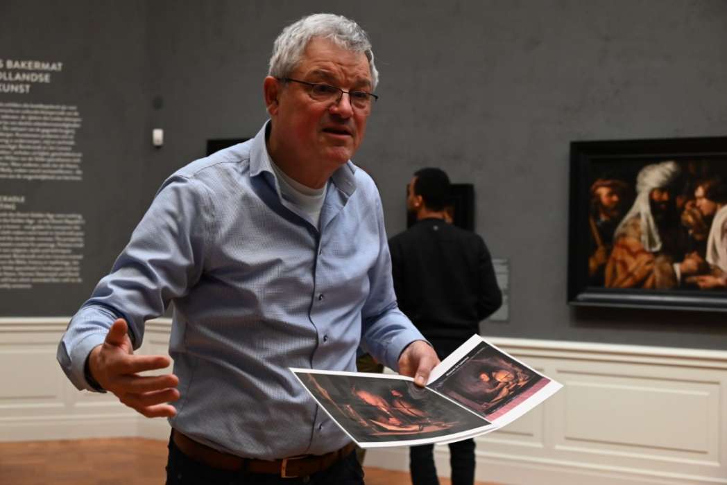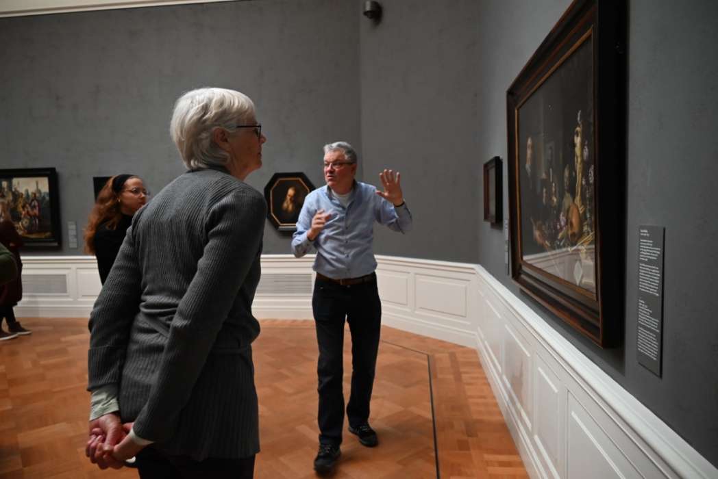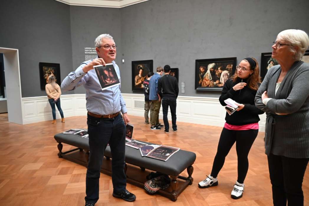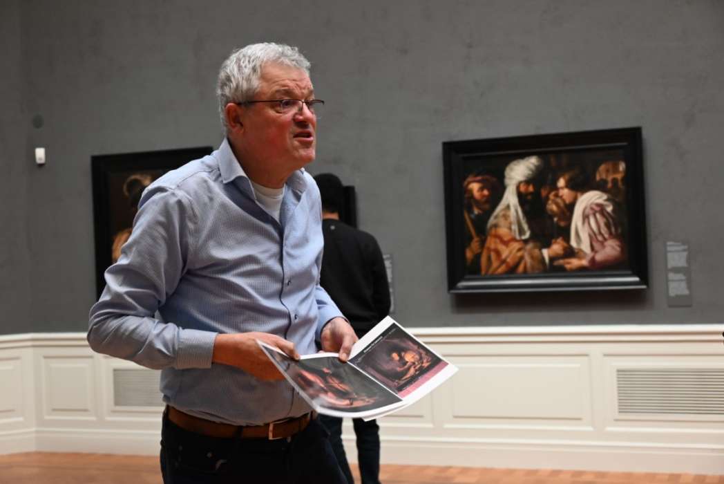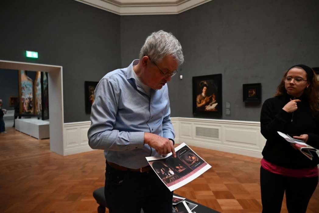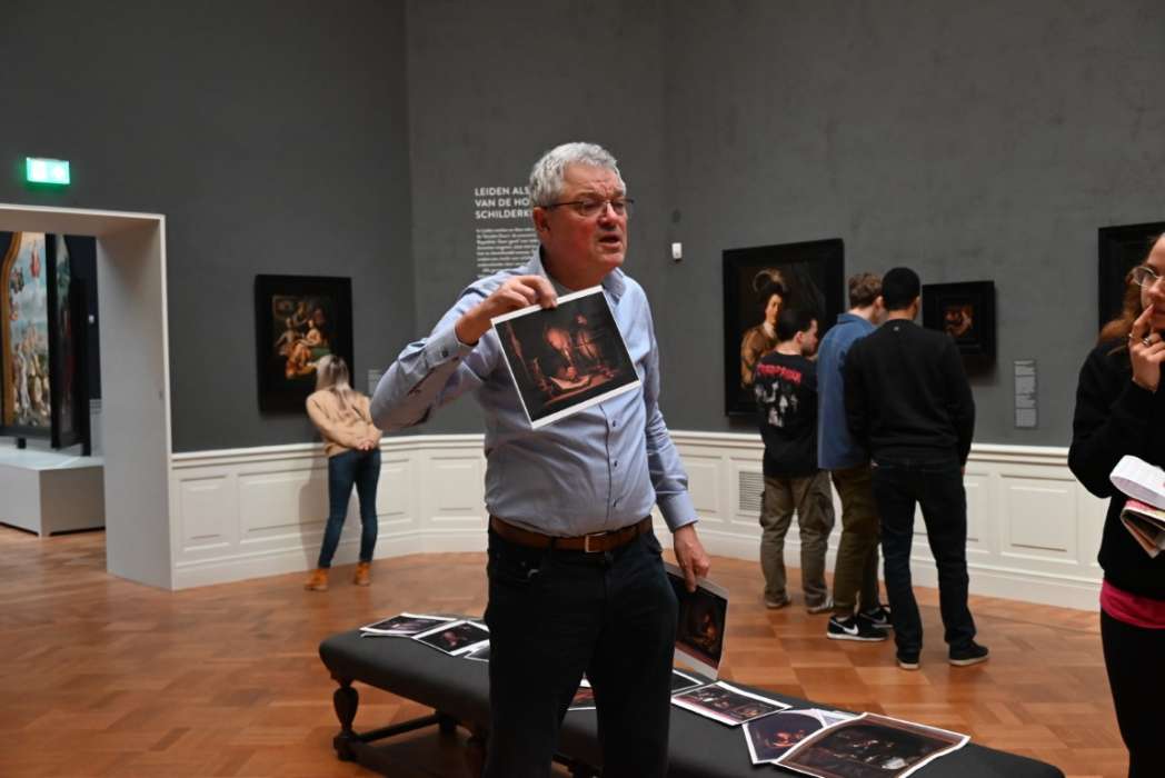 Hij besprak een schilderij van Gerard Dou, maar had ook een bank vol met uitgeprinte andere werken van Gerard Dou liggen. Aan de hand van verschillende schilderijen liet hij de overeenkomsten en verschillen in de werken zien.
