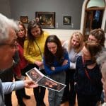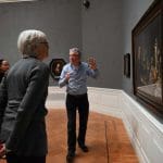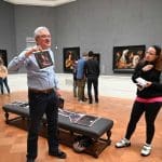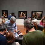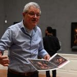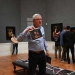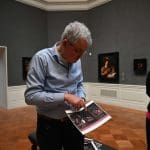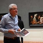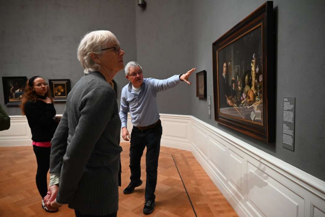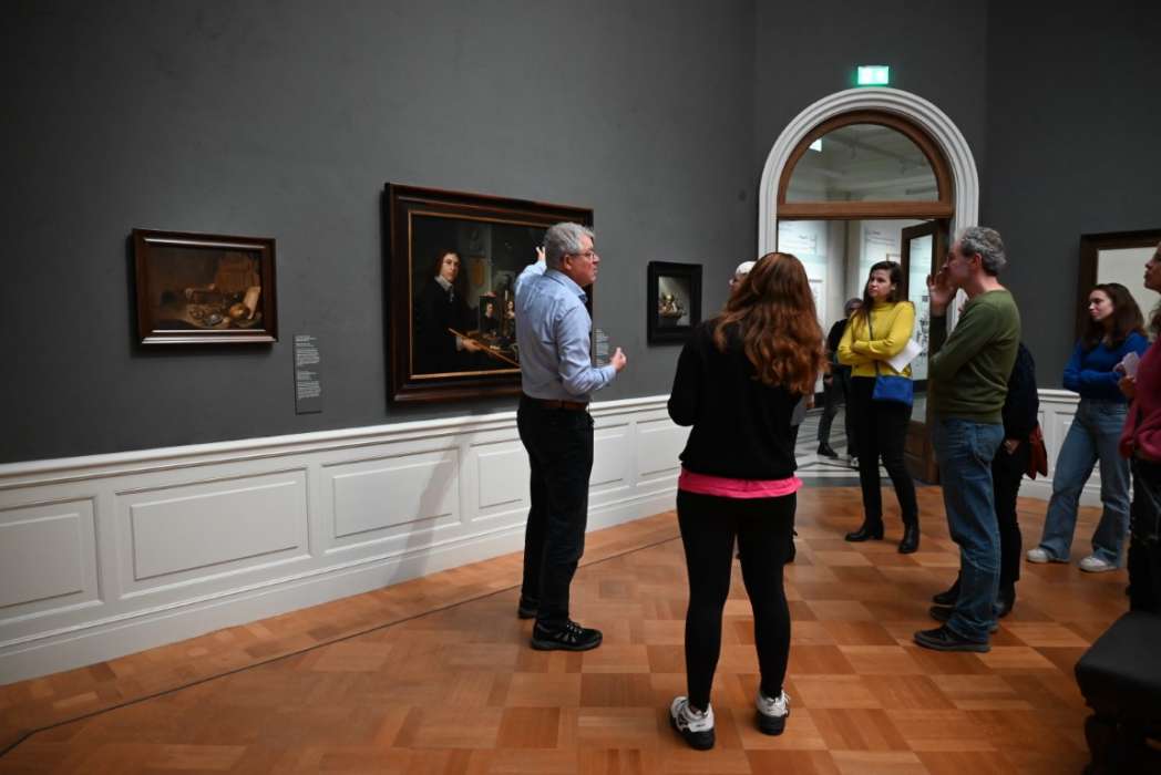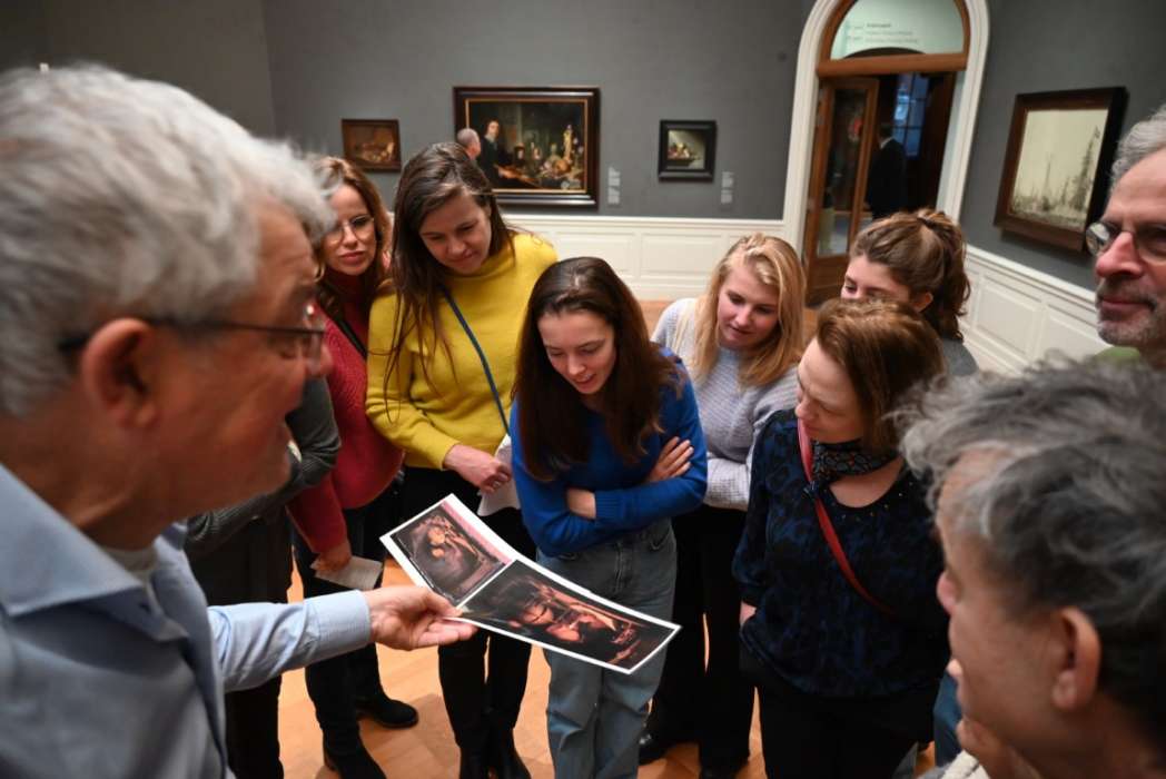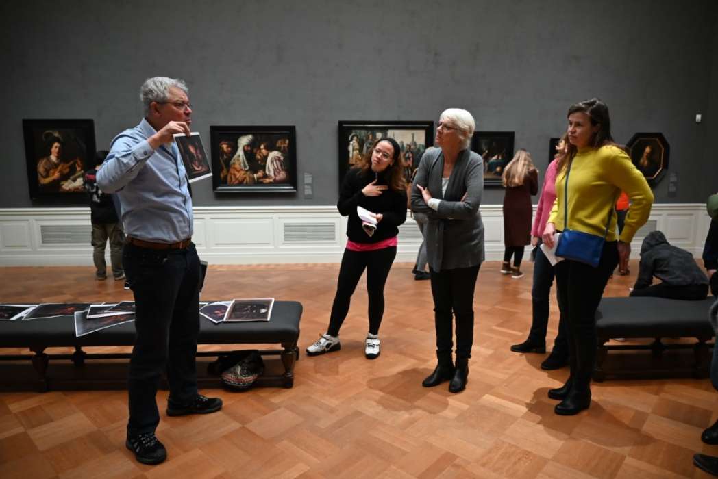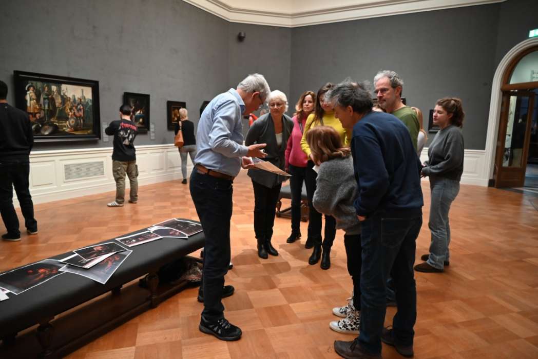 Hij besprak een schilderij van Gerard Dou, maar had ook een bank vol met uitgeprinte andere werken van Gerard Dou liggen. Aan de hand van verschillende schilderijen liet hij de overeenkomsten en verschillen in de werken zien.