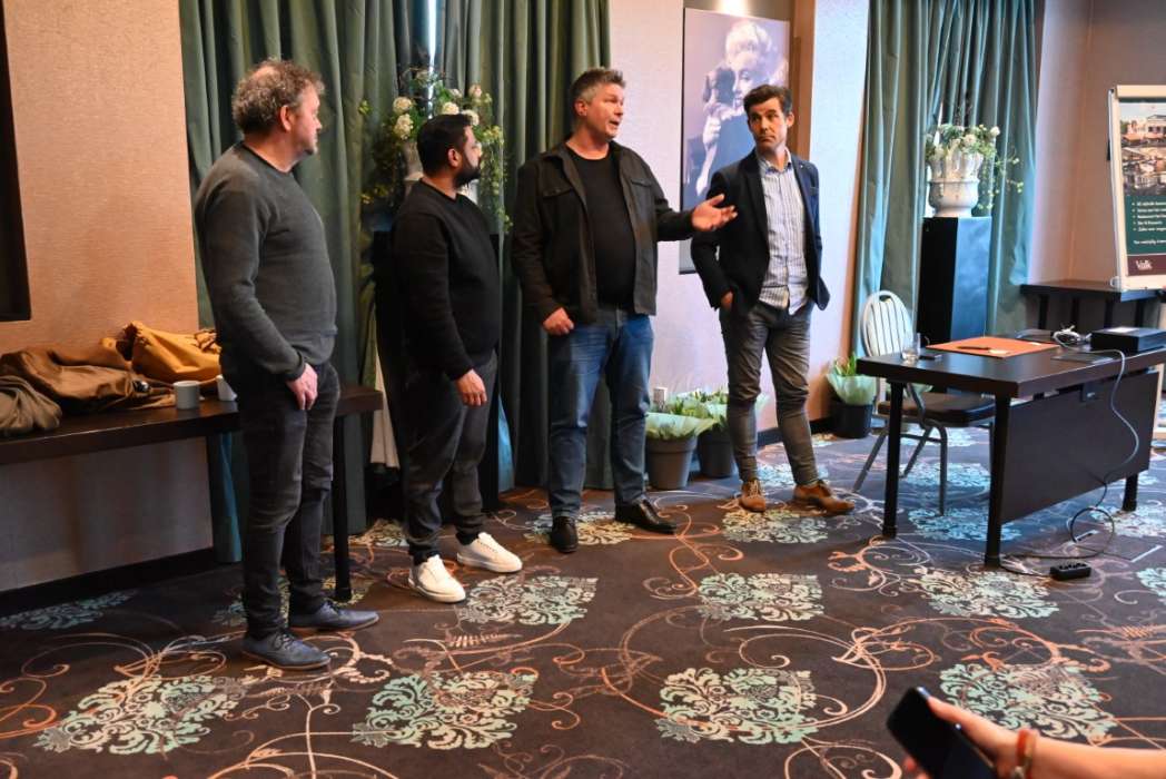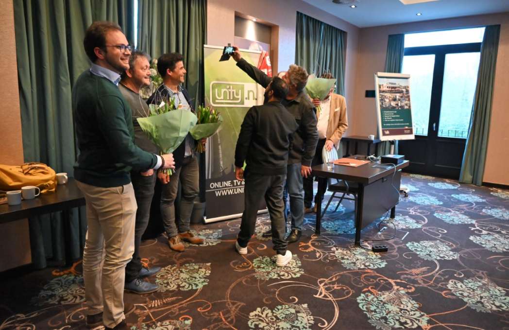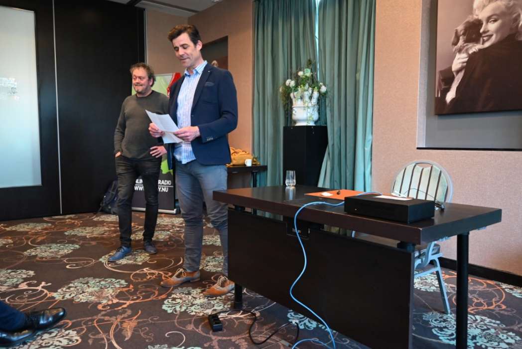 Voordat de groepsfoto genomen werd, eerst even een selfie van Rudo en Chris met de medewerkers van de beide omroepen. Het zou wel eens een Selfie kunnen worden die we later in de Leidse geschiedenisboekjes terug kunnen vinden 🙂