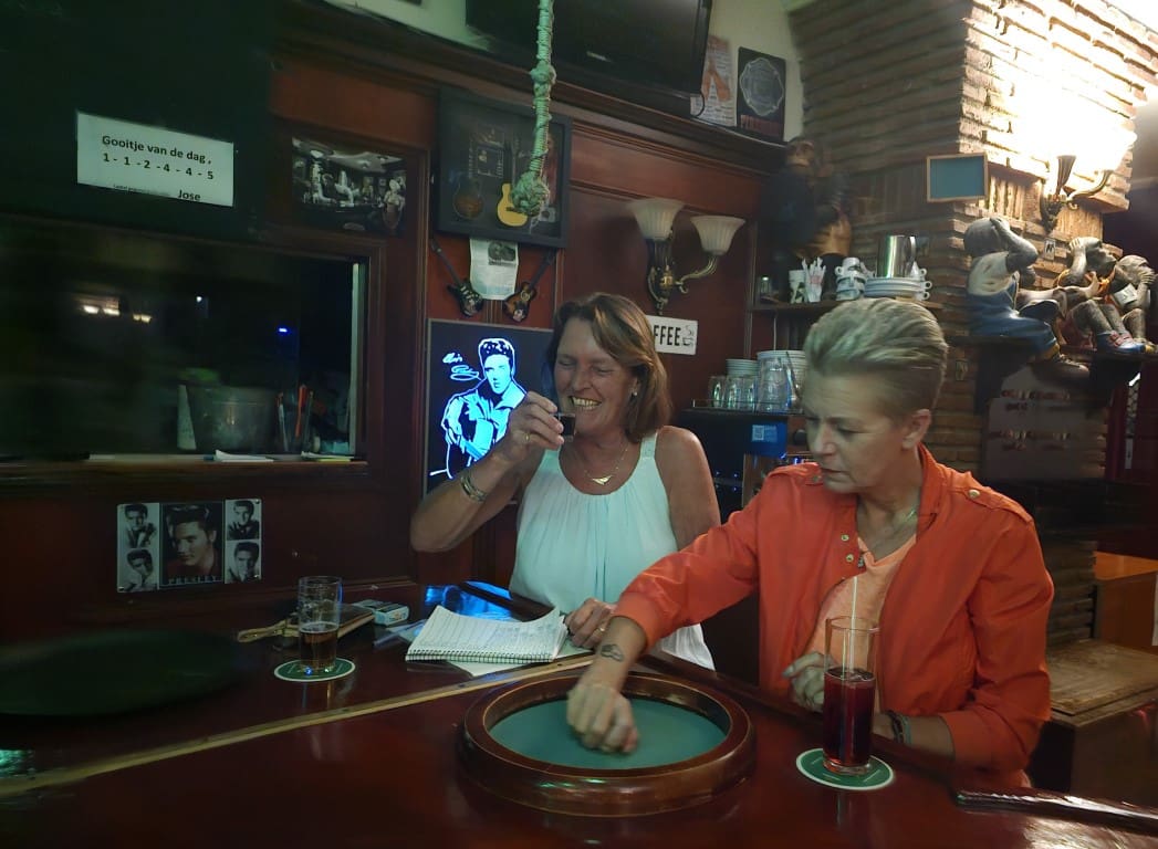Ik zit er natuurlijk ook om te dobbelen, zoals je in de vorige blog al kon zien. Zeventje gooien blijft dan ook een heerlijk en gezellig spel. Je moet natuurlijk geen 30 punten of meer gooien dan krijg je een shotje die Rien uitzoekt en die kunnen nog wel eens heftig zijn zoals Sylvia merkte 🙂 Angelique had er geen last van die gooide achter elkaar -5 🙂