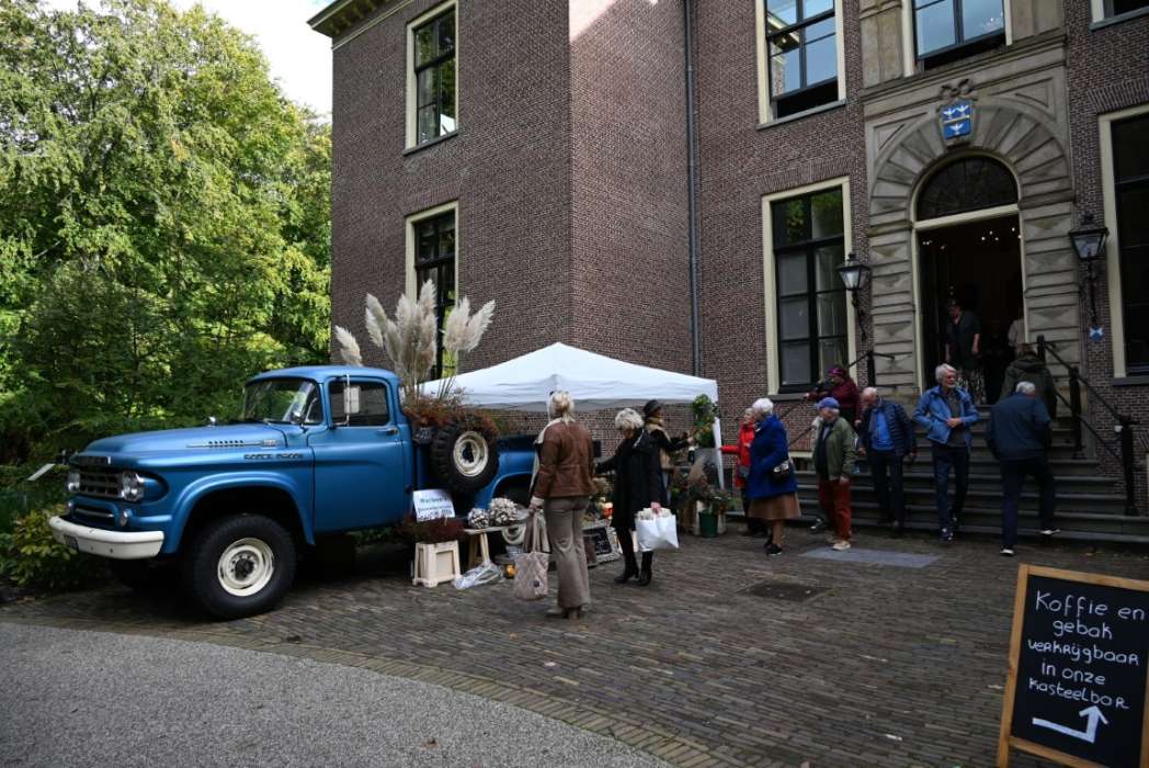 De fair was in de kamers van het kasteel, maar voor de deur kwam je al in de stemming met prachtige herfstboeketten.