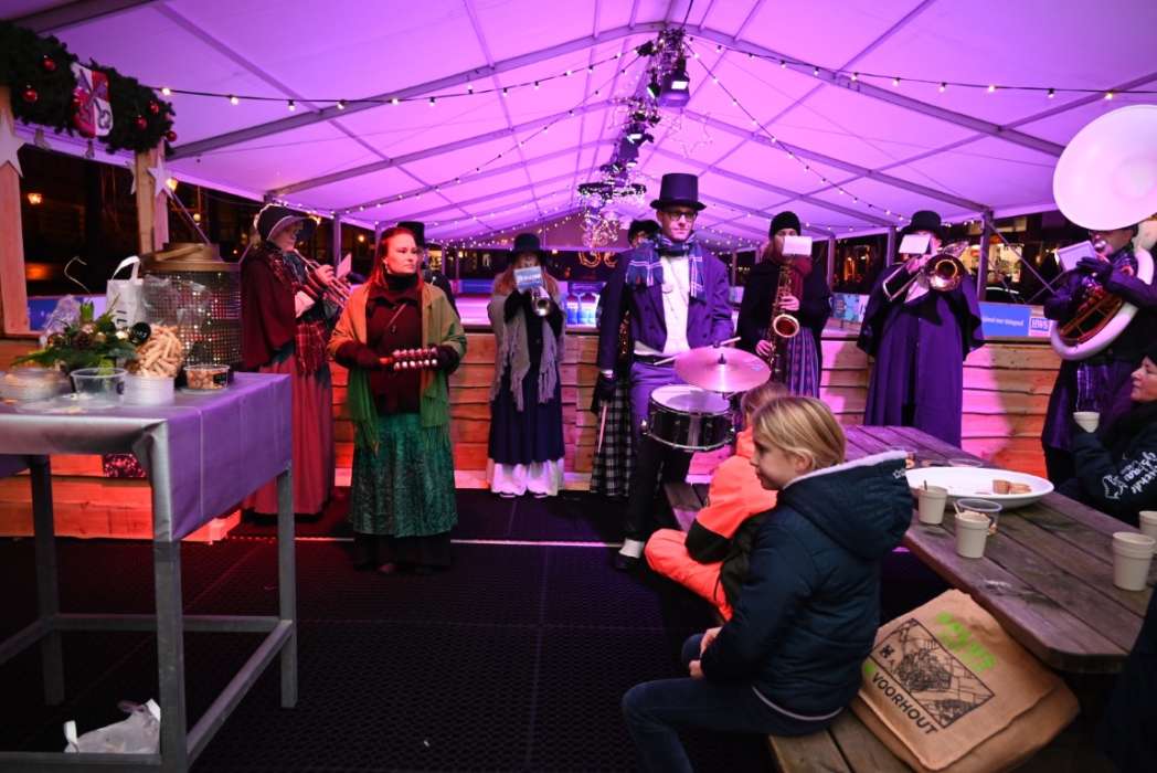 Ik mag het wel zo’n Dickens orkest.Alle huisjes zijn nieuw gebouwd dit jaar, nadat ze deze zomer in de opslag in vlammen op waren gegaan.