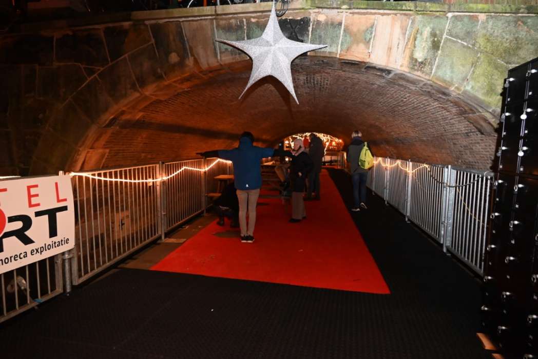 Ook dit jaar liggen er weer pontons onder de Koornbeursbrug, zodat je daar op je gemak je schaatsen kan aan- en uittrekken.