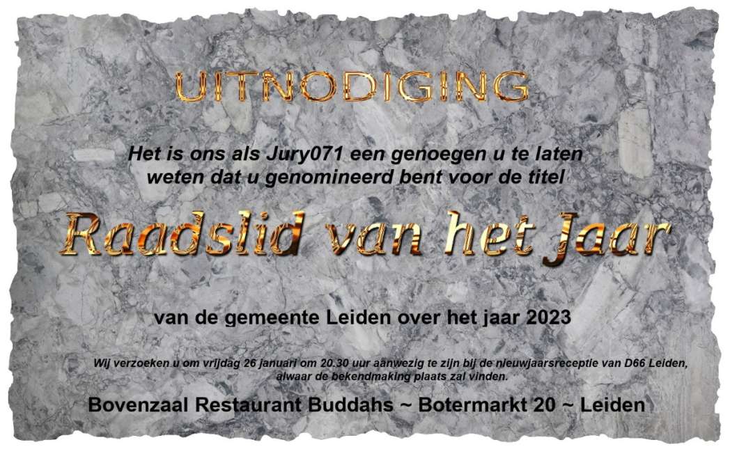 Sinds 2006 wordt er in Leiden het Leids Raadslid van het jaar gekozen. De verkiezing werd destijds in het leven geroepen door D66-er Paul van Meenen toen hij nog samen met Aad van der Luit met zijn tweetjes in de raad zat. Het was humoristich bedoeld en Paul van Meenen omschreef het als het raadslid dat het beste de toenmalige doelstellingen van D66 ondersteunde. Nadat D66 de meerderheid in de Leidse Raad kreeg konden ze natuurlijk zelf niet meer de verkiezing organiseren en werd Jury 071 in het leven geroepen. Jury 071 bestaat uit journalisten en voormalige raadsleden. Momenteel bestaat Jury 071 uit Annemieke Strijers (D66), Anna van den Boogaard (PVDA), Binnert Glastra ( Leidsch Dagblad), Chris de Waard (Sleutelstad), Emile van Aelst ( Leidse Glibber) en (niet op foto) Margreet van Wijk-Meijer (VVD).