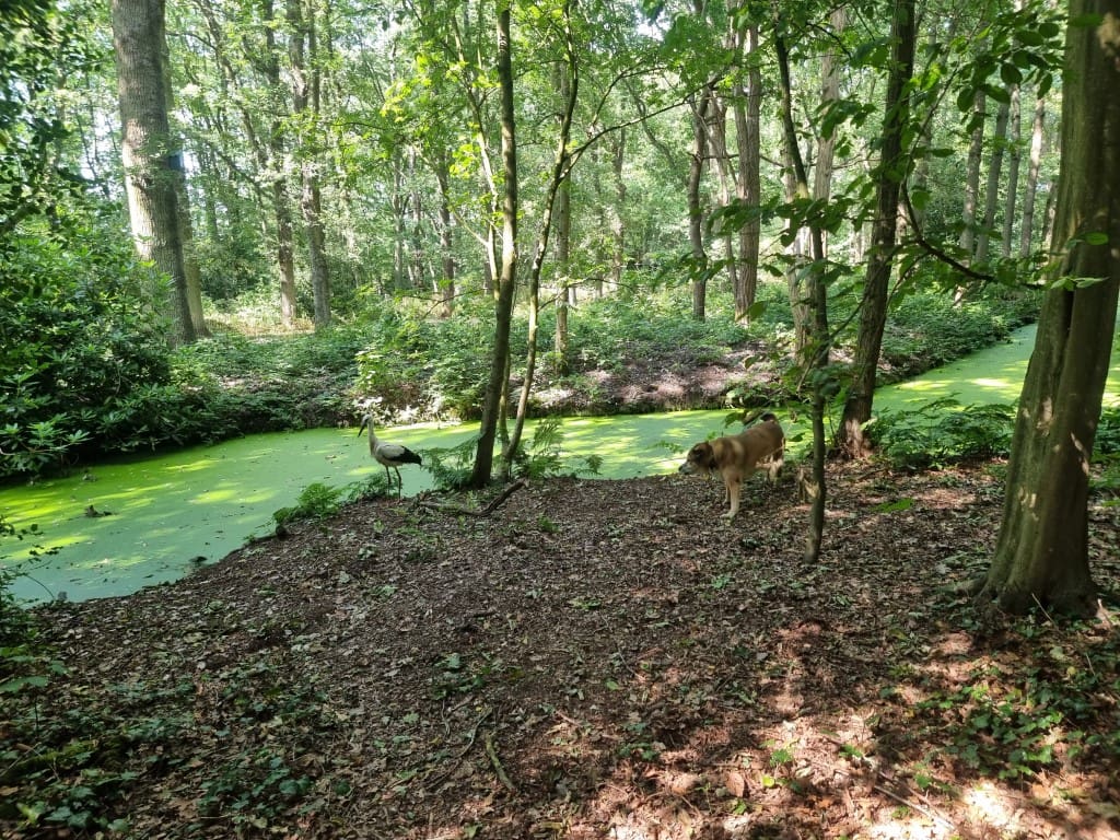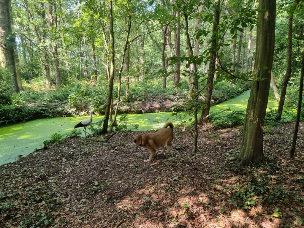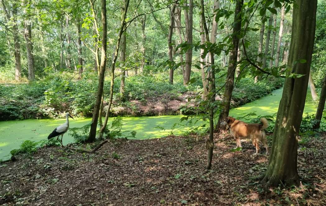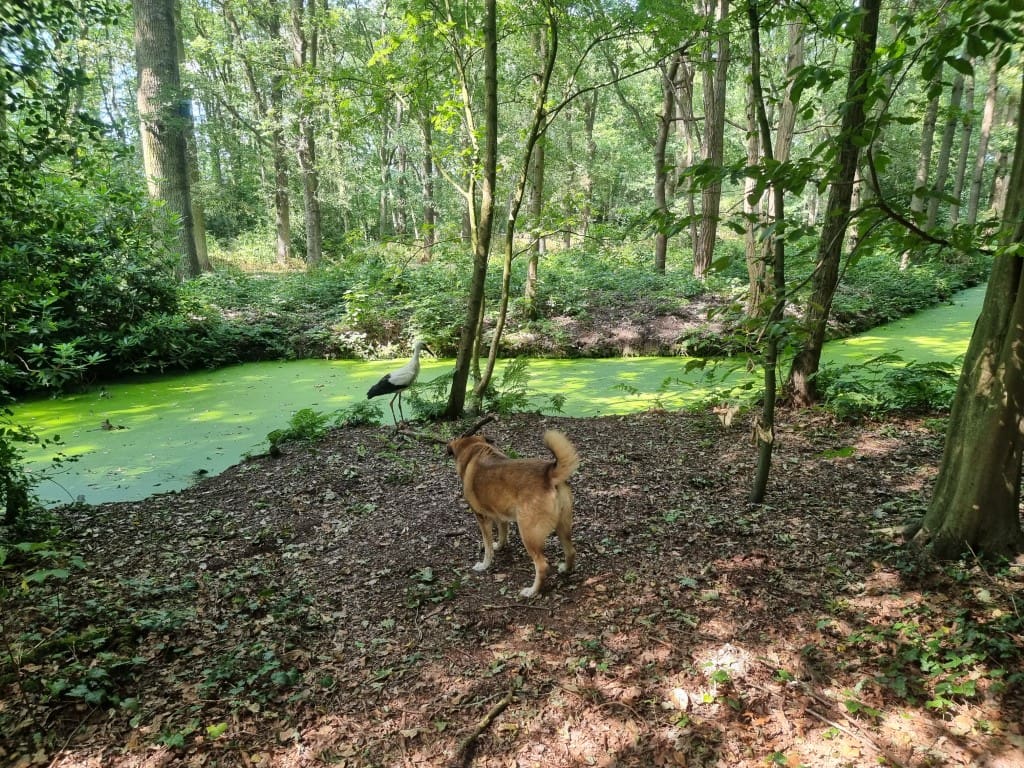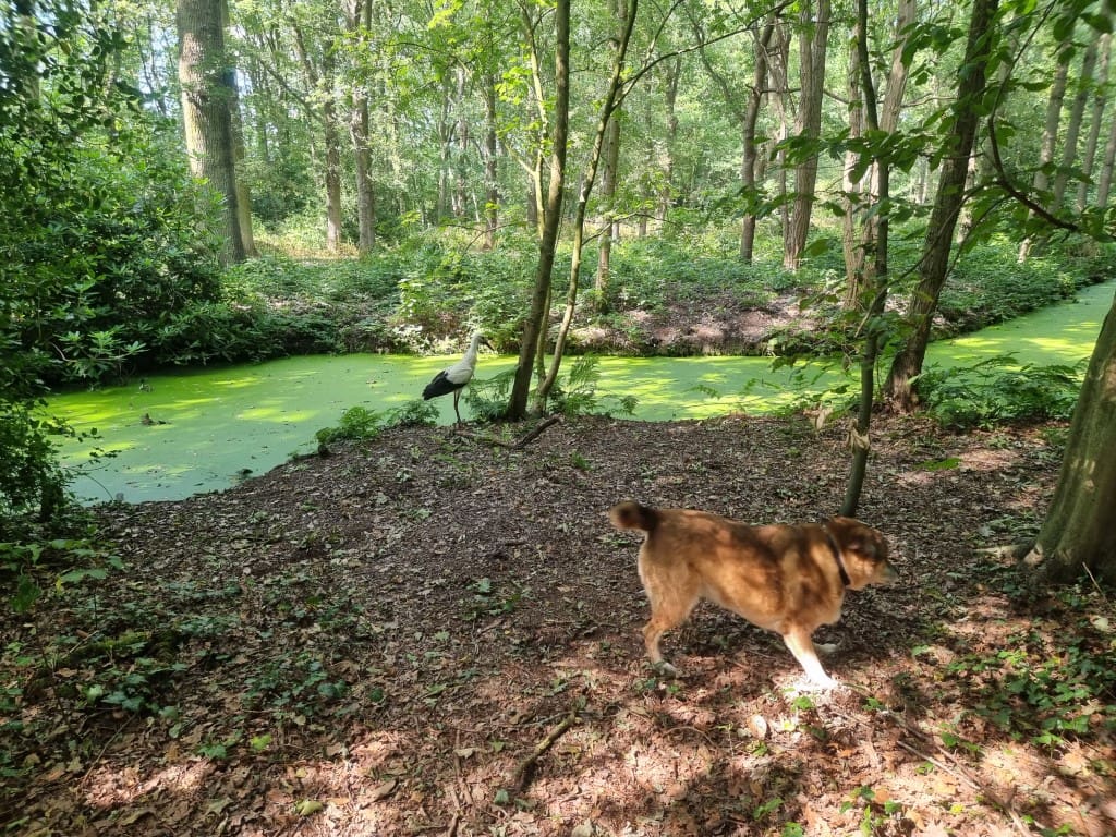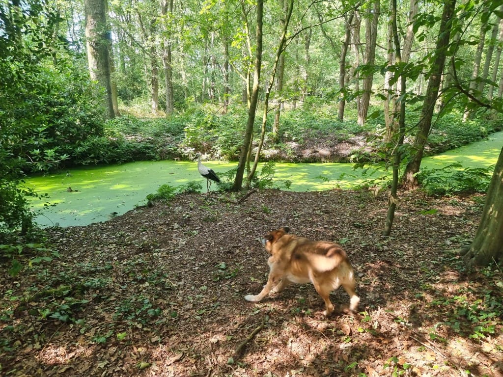 De ooievaar dacht: effe lekker mijn poten strekken, en toen kwam Happy eraan. Zelfs van het geblaf was het vliegbeest niet bang. Goed dat je de foto’s (en het filmpje) hebt bewaard.