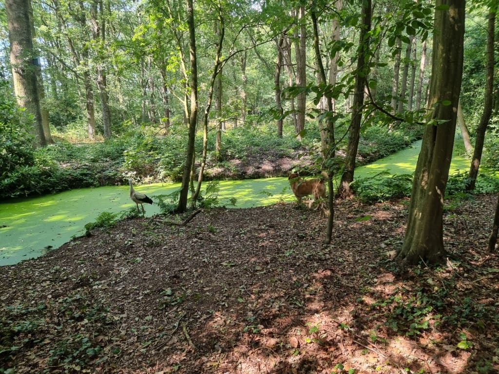 De ooievaar wist dat ook en was zo sportief het onderdeel in de lucht te laten varen en bleef rustig met twee poten op de grond. Happy kon hollen, stilstaan, wat dan ook de ooievaar liep zo nu en dan wat heen en weer en liet zich niet intimideren door Happy.