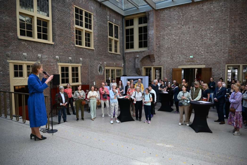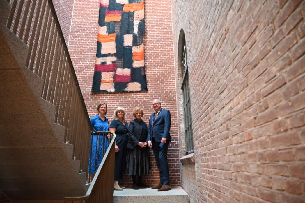 Binnen was er direct al een tweede heuglijk feit. Speciaal voor het 150 jarig bestaan heeft Claudy Jongstra een wandkleed gemaakt dat vandaag onthuld werd.