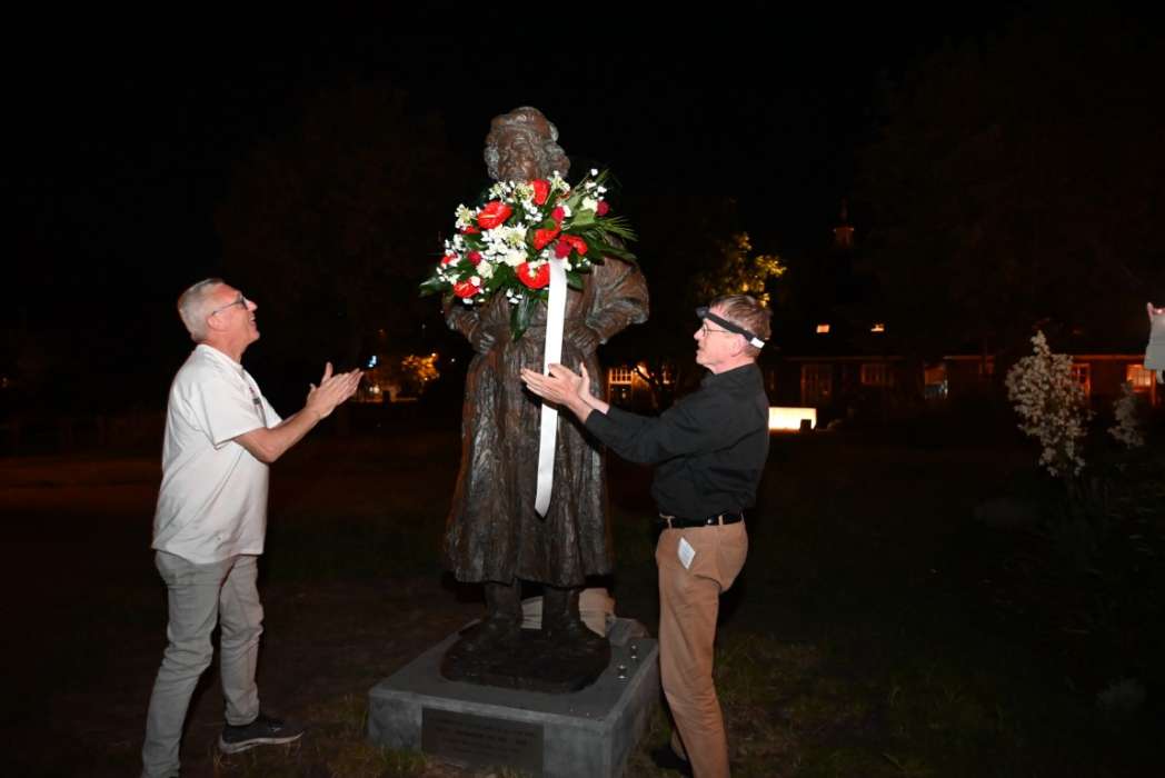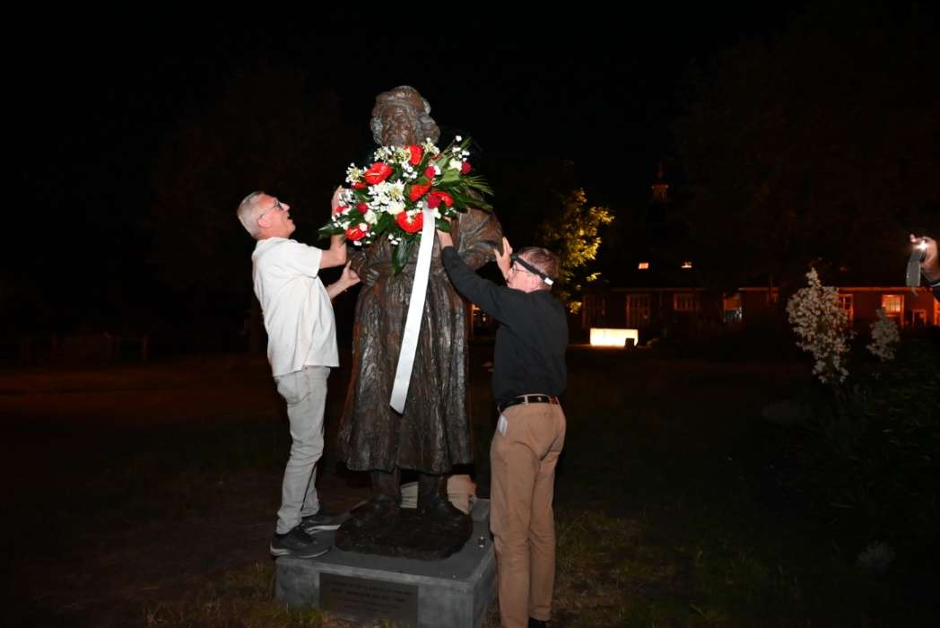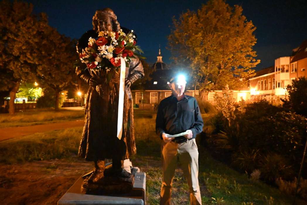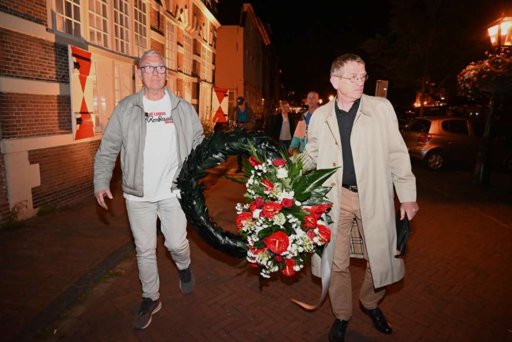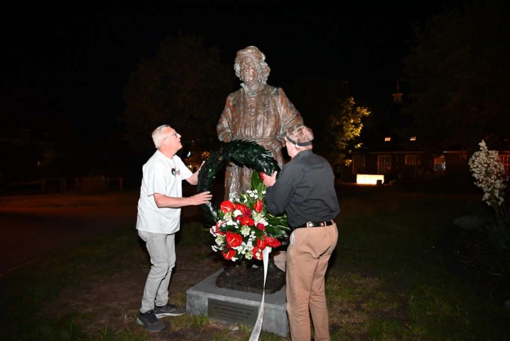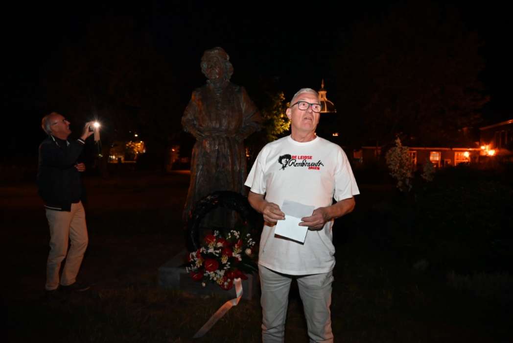 Om twaalf uur hingen Tjeerd Scheffer en dichter Leo van Zanen de krans om de schouders van Rembrandt.