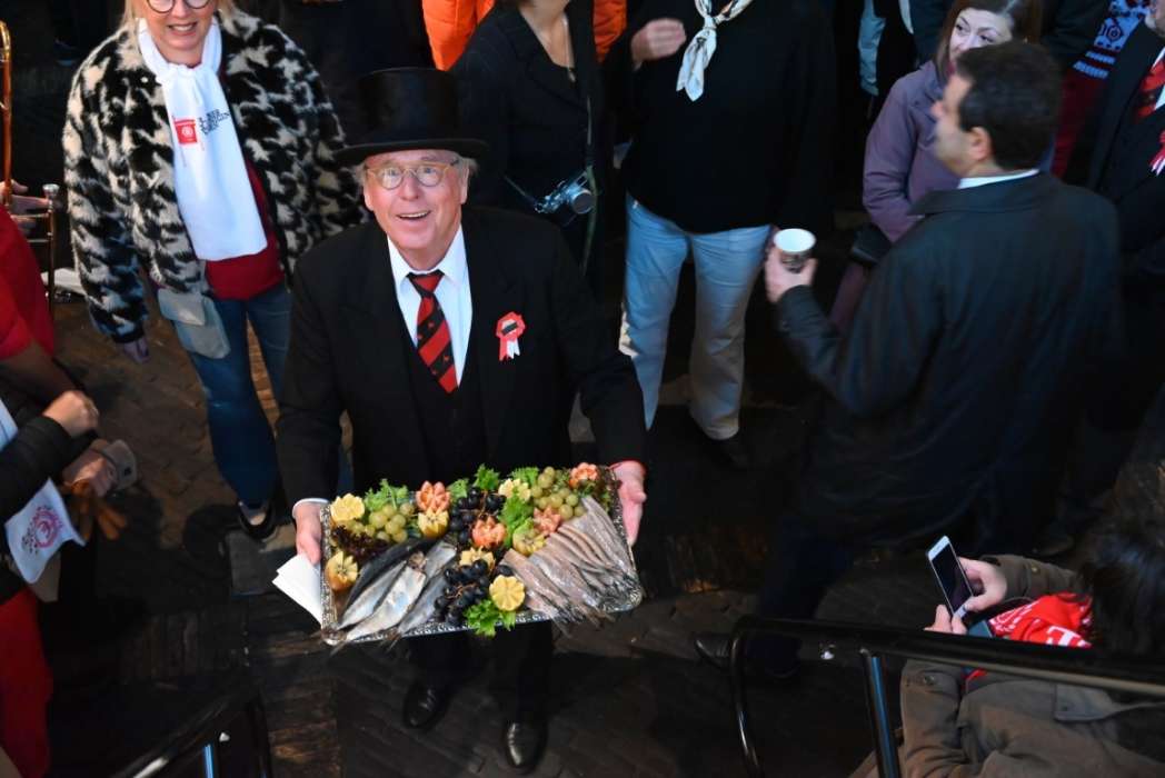 Ton Elderhorst kwam de schaal met haring brengen om te laten proeven. Er was ooit een burgemeester die een vuile haring opat, sindsdien liggen er altijd een paar vuile haringen op de schaal.