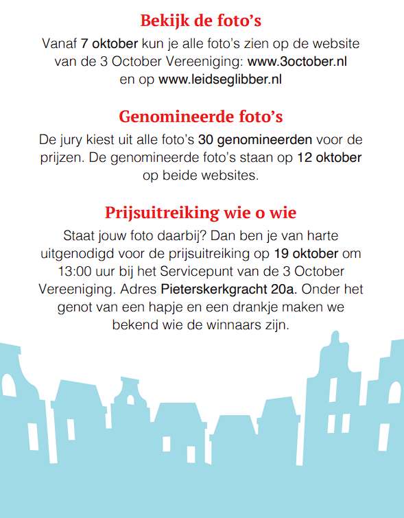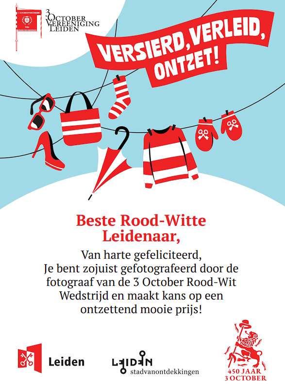 Tijdens de optocht heb ik een aantal toeschouwers gefotografeerd die perfect in Leids Rood-Wit gekleed waren. In de fotoslideshow onderaan komen ze allemaal langs. Degenen die ik fotografeerde hebben als het goed is een flyer met uitleg gekregen. Zo niet dan lees je hieronder de uitleg. Er zijn veel mooie prijzen te winnen, dus houd goed in de gaten of je zaterdag 12 oktober op deze site tussen de 30 genomineerden staat.