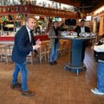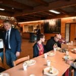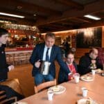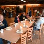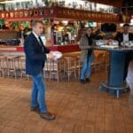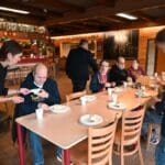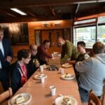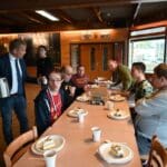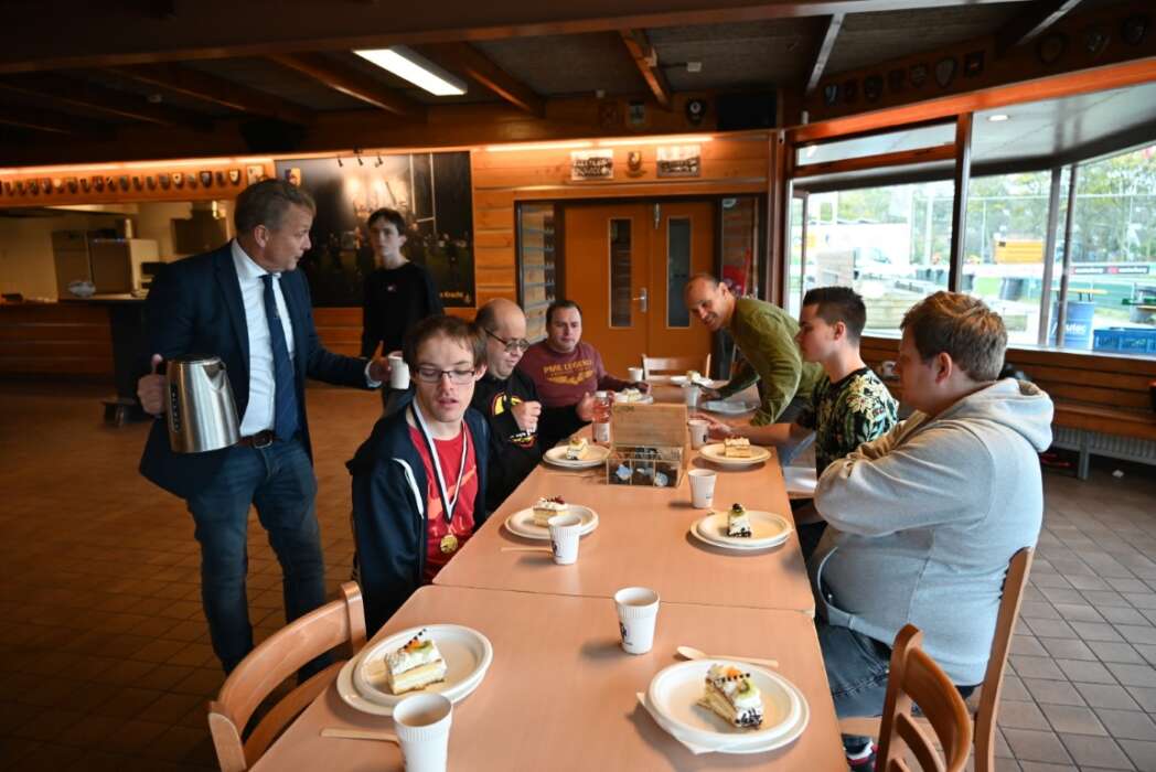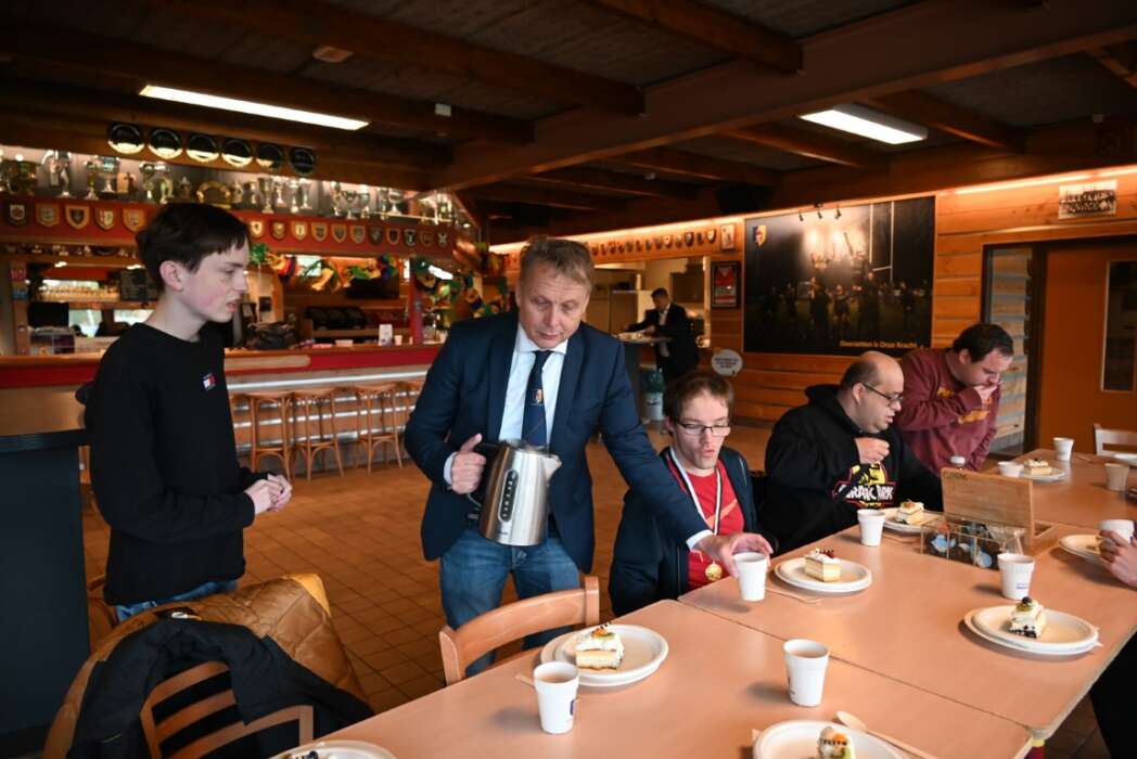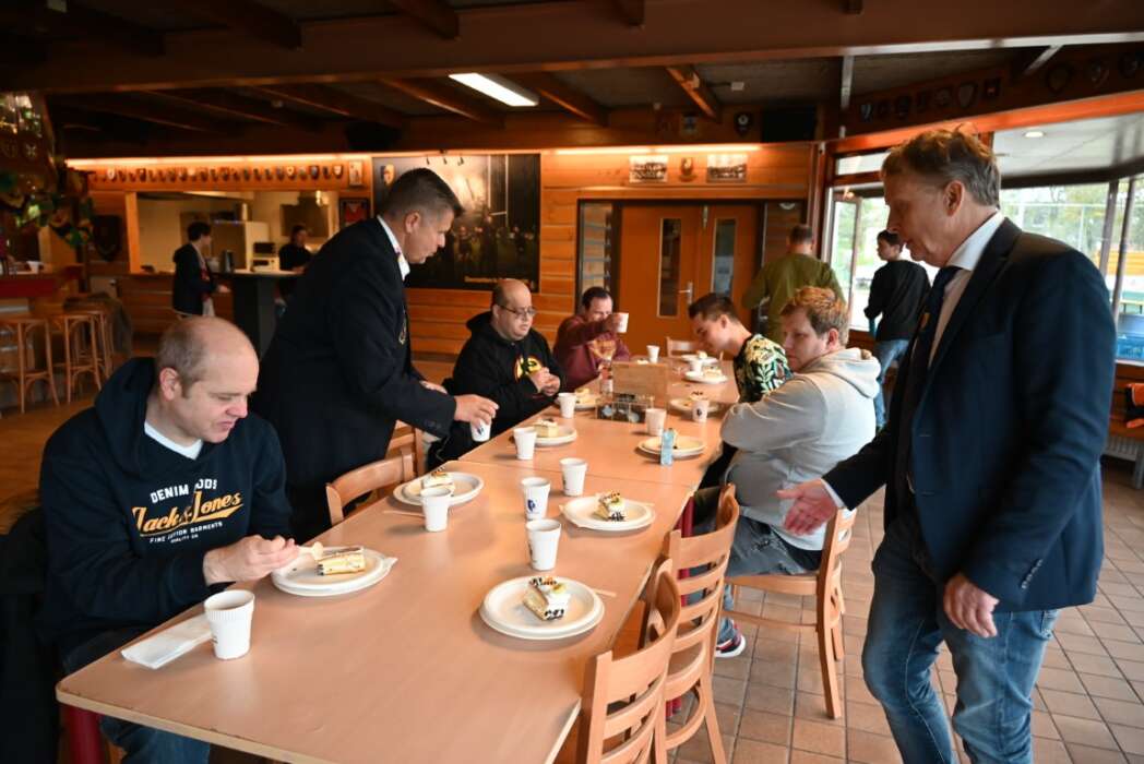 Terwijl Ed de taart aan het snijden was, schonk Marcel de koffie en thee in.