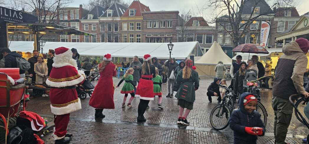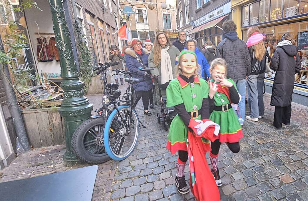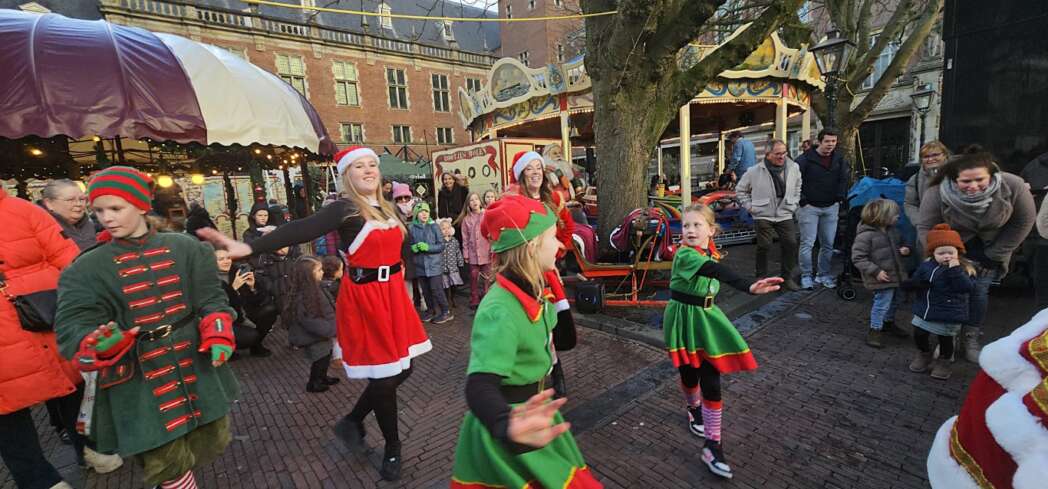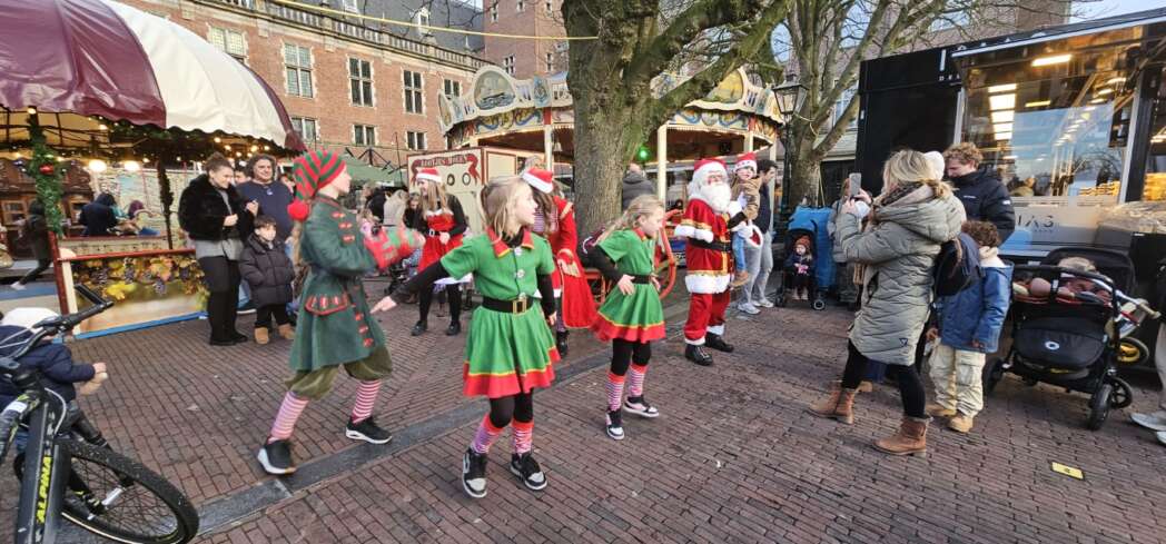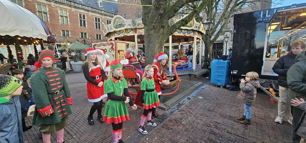 Ik dacht dat de kerstgroep optrad op het Stadhuisplein, maar zag niets. Ik kwam de kerstelfjes tegen in de Burgsteeg, ze kwamen net van de Kerstmarkt waar ze ook opgetreden hadden. Over een kwartiertje treden we weer op bij het Stadhuisplein vertelde de Kerstman.