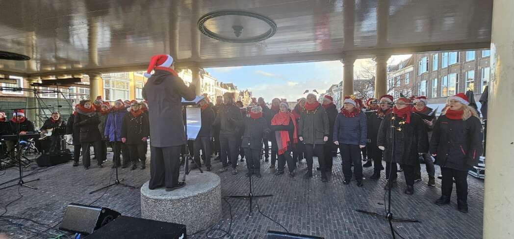 Het was ondanks het slechte weer druk in de stad. Het Eurokoor had het niet koud, die zongen zich warm op de Koornbeursbrug.