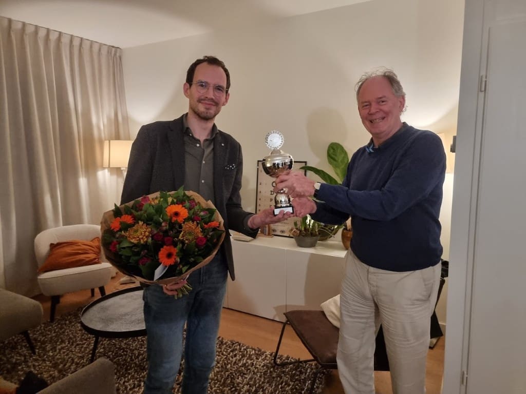En werd de beker bij Pieter Krol thuis gebracht omdat er geen fysieke nieuwjaarsreceptie was.