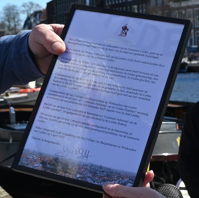 Uiteraard een en al lof en een paar mooie anekdotes, maar ook een oorkonde. Het college van van B&W had besloten Peter te benoemen tot Luitenant – Admiraal van de Leidse Grachten.