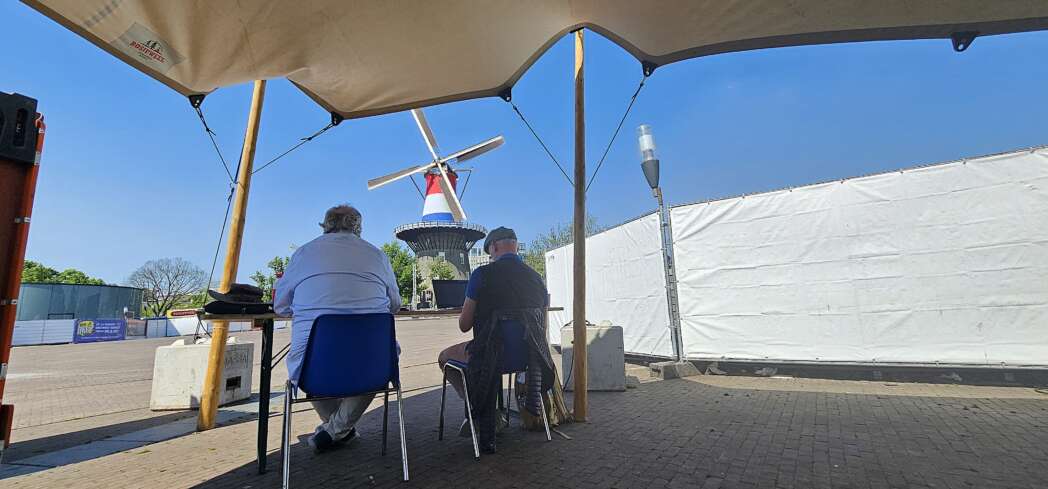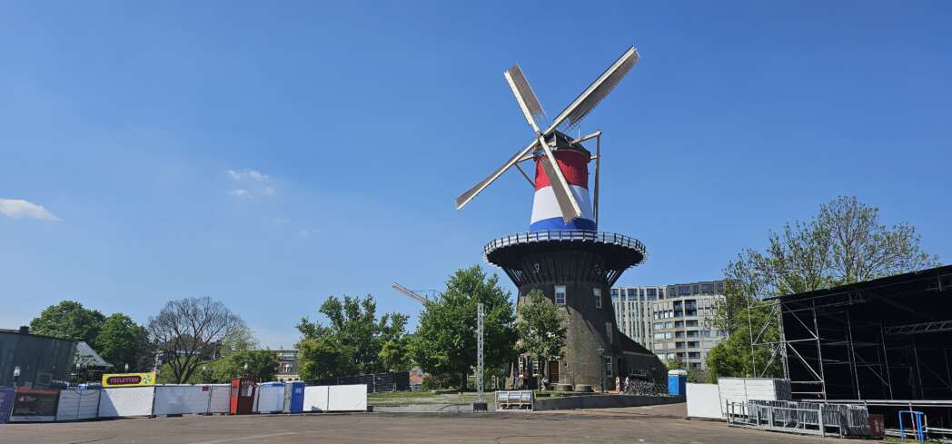 Na een paar drukke weken en een druk Koningsdagweekend, zijn de weergoden mij goed gezind en was het precies de drie dagen dat ik weinig tot niets te doen had echt zomers weer. Ik heb er even van genoten want komend weekend weer druk met 3, 4 en 5 mei en daarna gelijk weer door met de Leiden Marathon en de voorbereiding daarvan. Dus even heerlijk genoten van het mooie weer. Trouwens mooi gezicht de ingepakte Molen de Valk en een nu nog leeg festivalterrein.