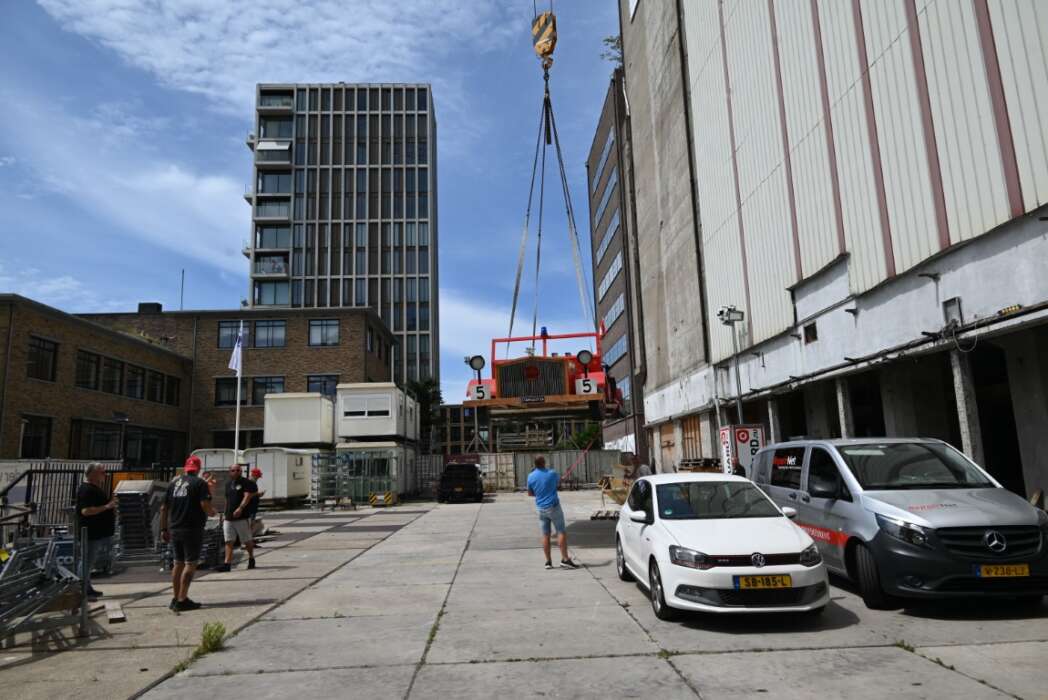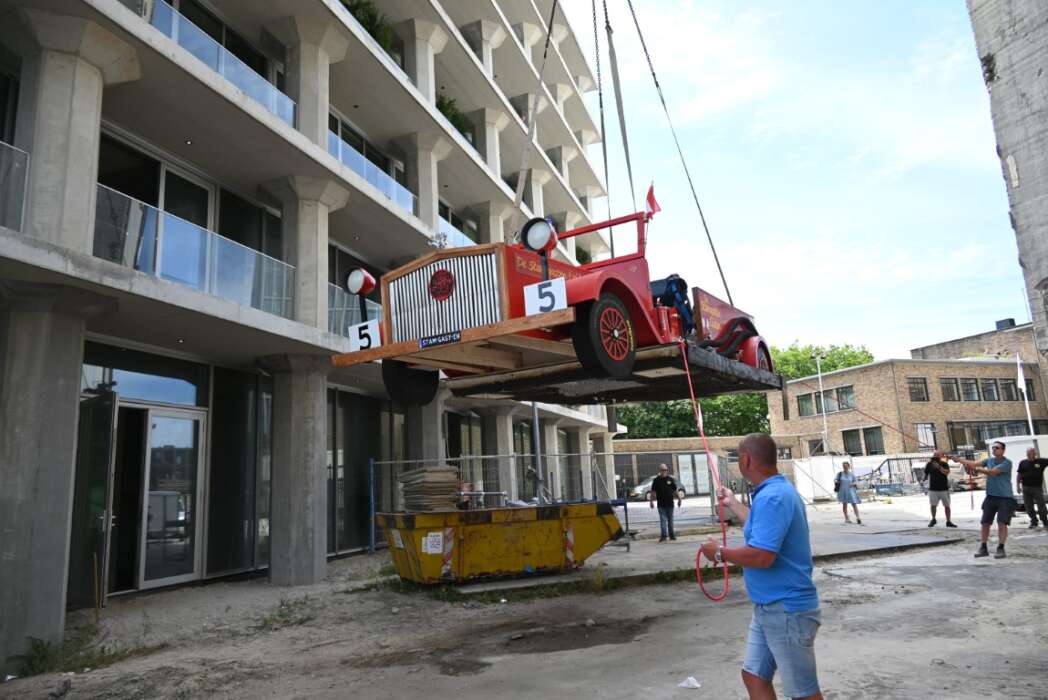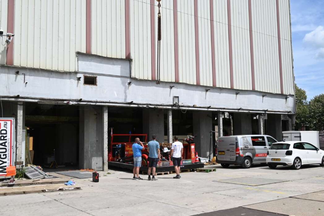 Voorzichtig werd hij de hal uit getakeld en konden de zwaarden er nog op gezet worden.