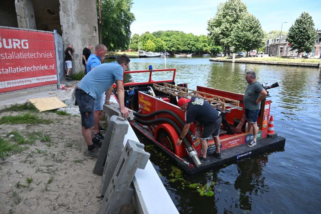 Alleen hoe krijg je hem in het water. Gelukkig was er een ‘kraantje’ voor handen.