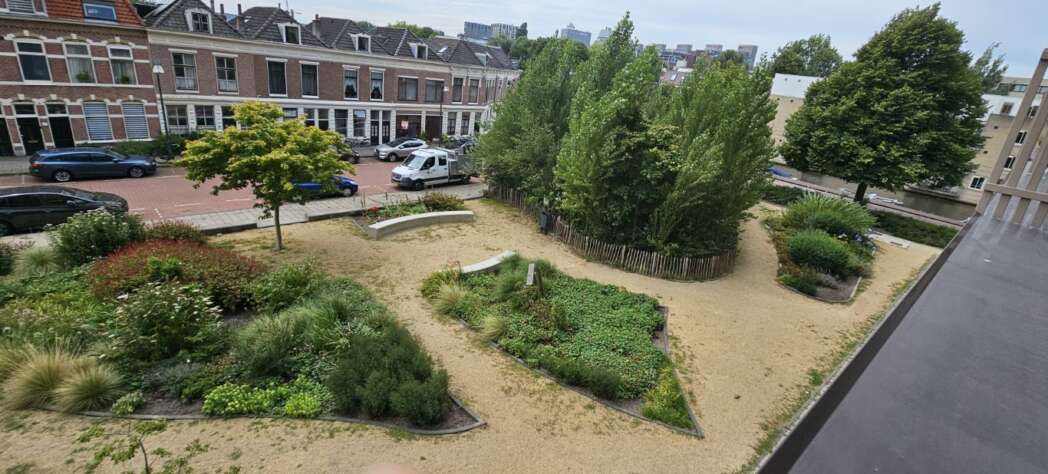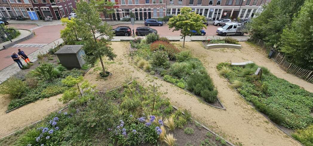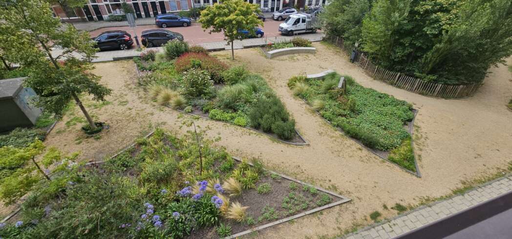 Op afstand ziet het parkje er netjes uit, een mooi stukje groen.