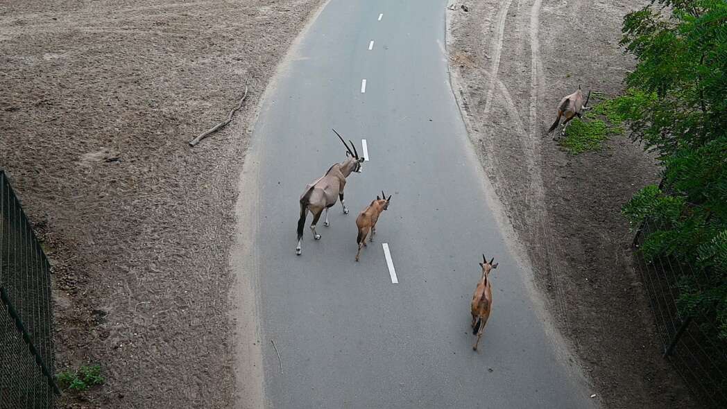 Links en rechts zie je dieren staan die je normaal niet in het weiland tegenkomt.