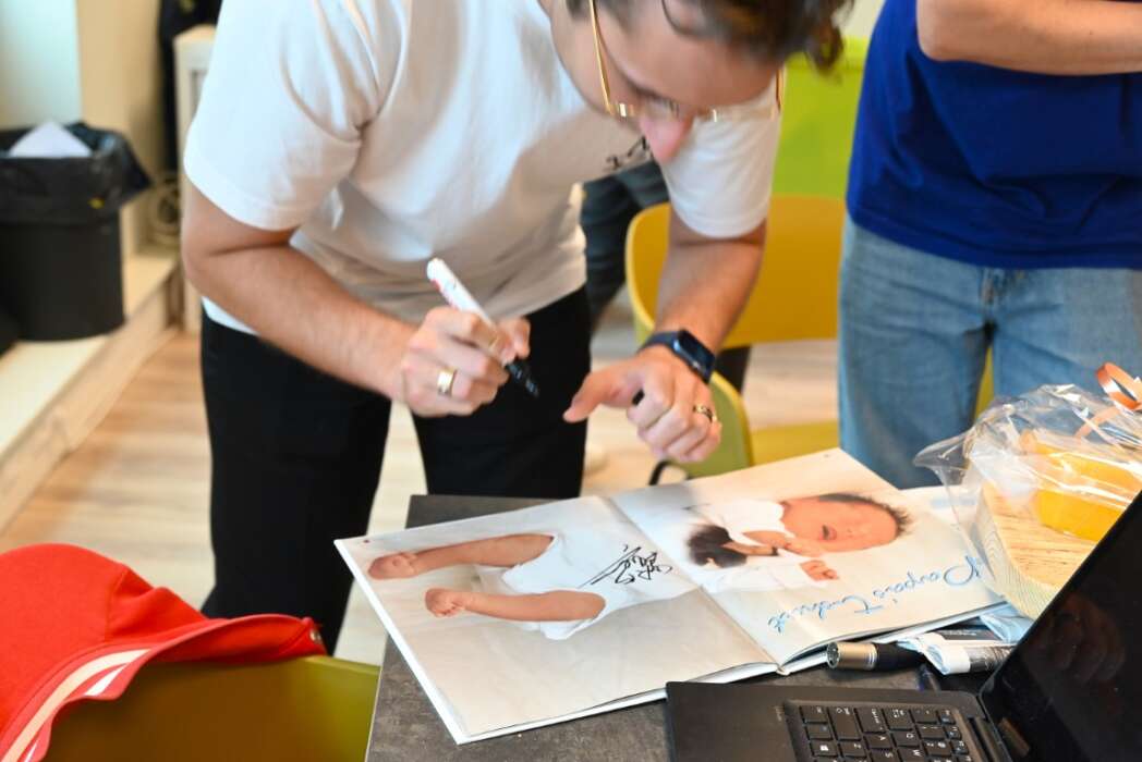 Christiaan mocht een handtekening zetten bij zijn eigen babyfoto.