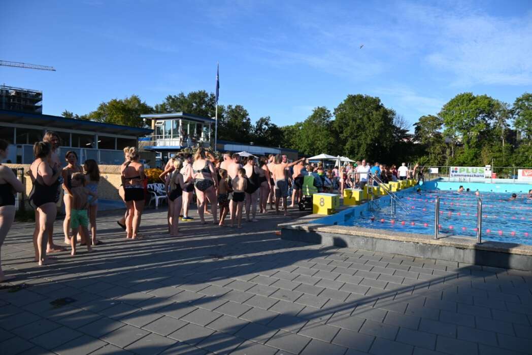 Terwijl de eerste zwemmers het water al uit kwamen stond er nog steeds een lange rij te wachten om het water in te gaan.