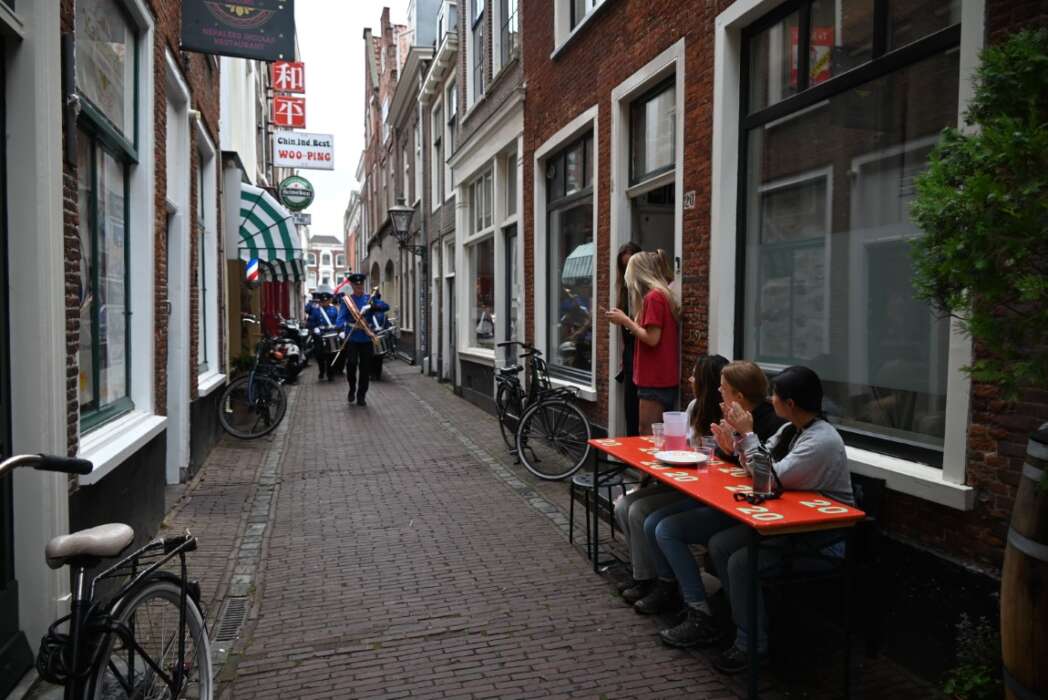 Een paar minuten tien kwam drumfanfare FBL via de smalle Pieterskerk Choorsteeg aangemarcheerd.