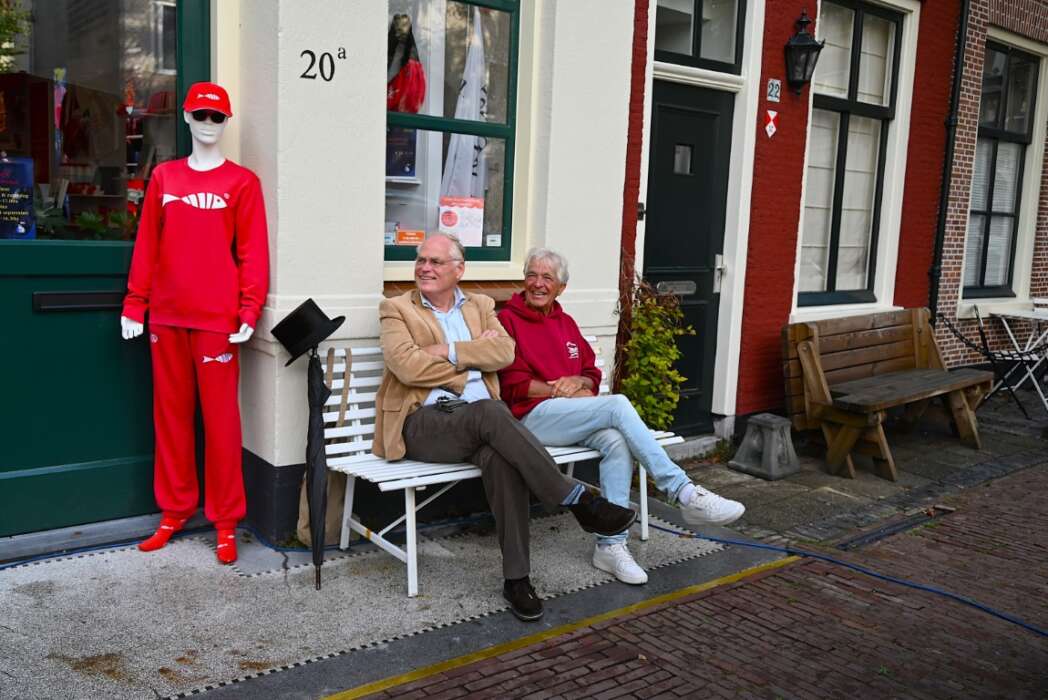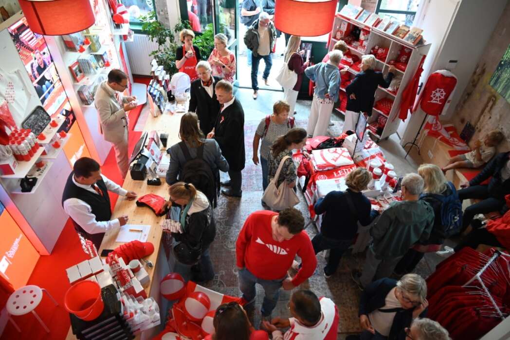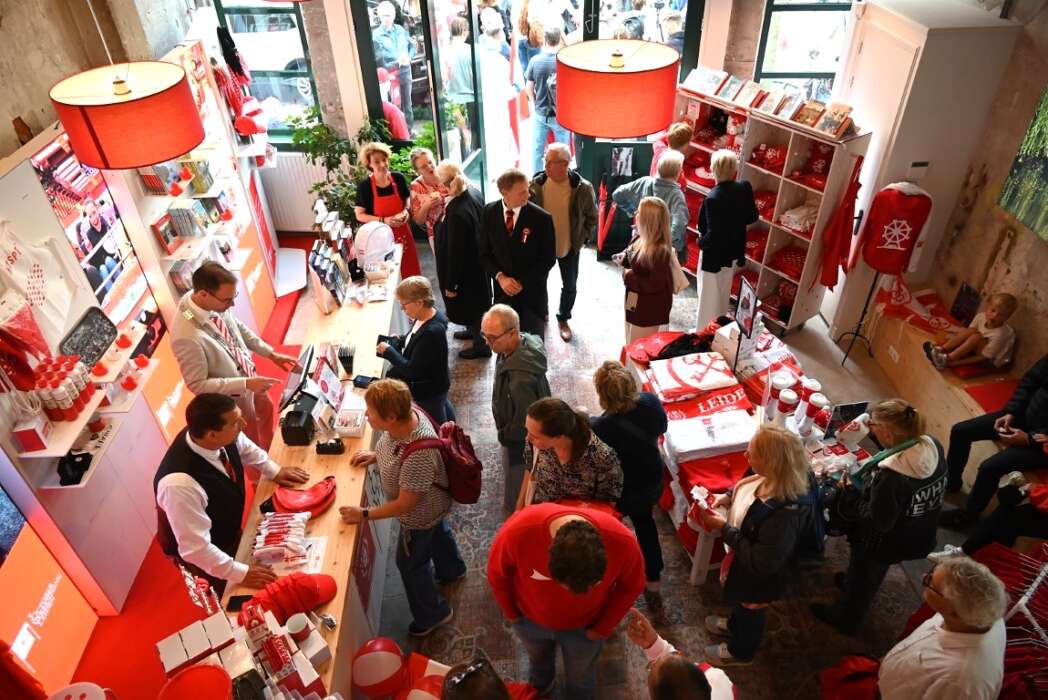 Nadat beiden het Servicepunt geopend hadden, kon de verkoop van de merchandise beginnen. Rogier van der Sande vulde zijn voorraad Leidse artikelen aan en Peter Heijkoop stond voor deze gelegenheid achter de verkoopbalie.