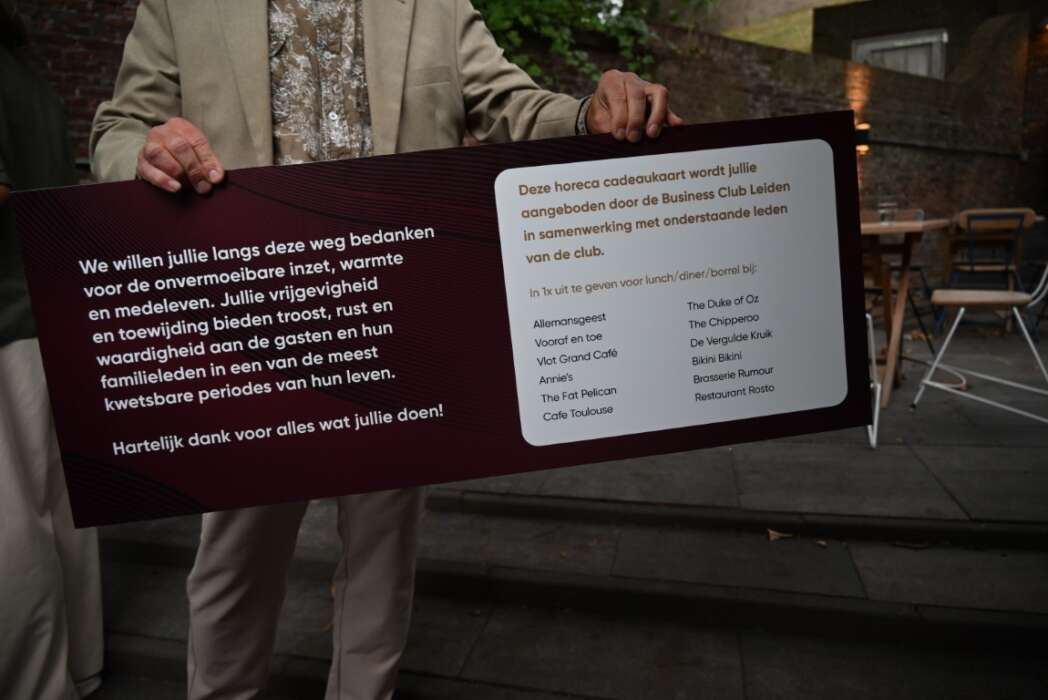 Vervolgens kwam een aantal Leidse Horeca-ondernemers naar voren en ook Jacqueline Bouts, directeur Jongeren Hospice Xenia en Marco van der Ploeg, directeur Hospice Issoria.