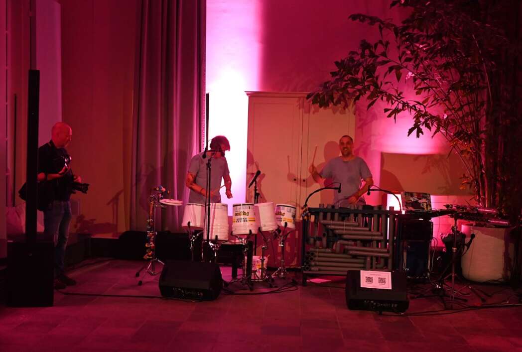 Ik dacht dat in de Oranjerie een paar van die Japanse trommelaars stonden. Brigitte ging luisteren en zag dat het niks met Japan te maken had. Gewoon plastic bussen en pijpen.