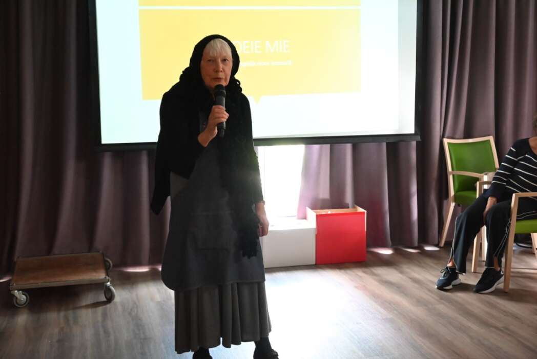 Goeie Mie vertelde dat ze een middagje verlof heeft gekregen van het tuchthuis, maar zich niet het lot van de mensen om haar heen aan mocht trekken en ze zeker niets te eten of te drinken mocht geven.