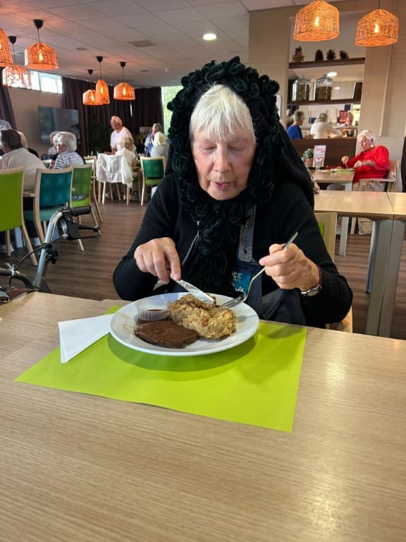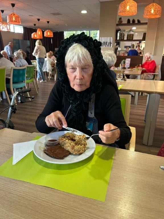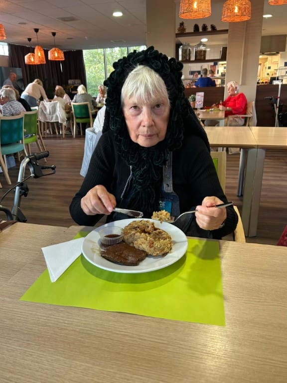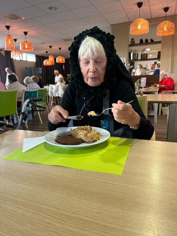De middag werd afgesloten met een hutspotmaaltijd voor alle bewoners. Ik had mee mogen eten er was nog een plekje vrij aan tafel bij Goeie Mie. Iets in mij zei, doe maar niet.