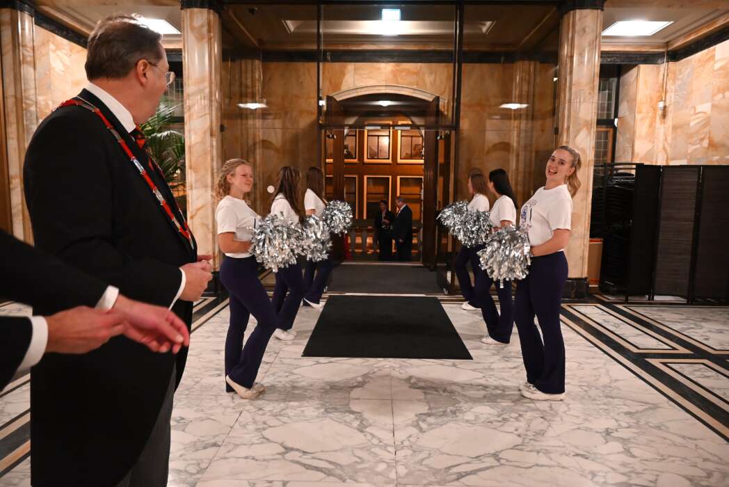 Dit jaar bestaat het Leidse Zorg & Zekerheid 200 jaar. De verzekeraar werd opgericht als betaalbare verzekering ten behoeve van Leidenaren. Al tweehonderd jaar werkt Z&Z zonder winstoogmerk en vloeien alle winsten naar de leden en gezondheidsprogramma’s. De Raad van Bestuur had een etentje aan de overkant van het Stadhuis en werden met een smoes het Stadhuis in gelokt. Bij de ingang werden ze opgewacht door de cheerleaders van ZZ Basketball Leiden.
