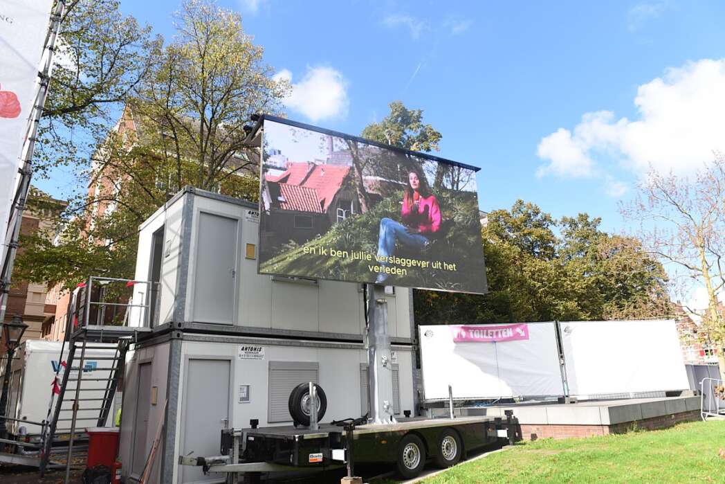 Op grote schermen was het hele feest te volgen en zag je de beelden die ook live op TV werden uitgezonden door Omroep Sleutelstad en RTV Katwijk. Leuk dit jaar was dat er een speciale verslagever naar het verleden was gestuurd en interviews had met Cornelis Joppenszoon en een aantal Spaanse soldaten.