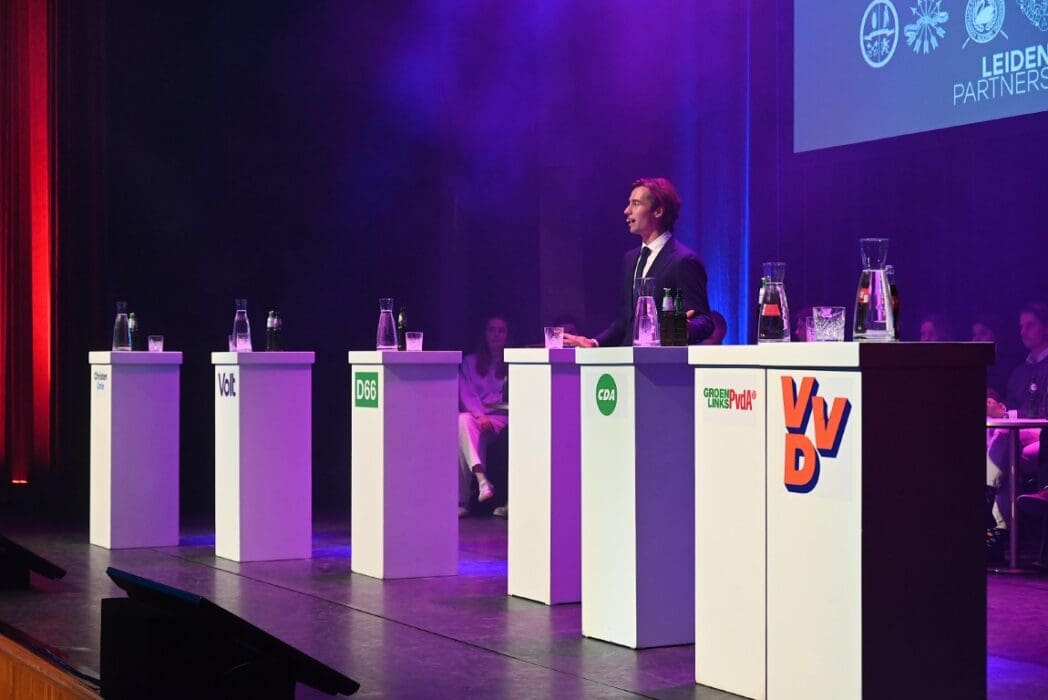 Er waren zes partijen die hun kandidaten naar Leiden hadden gestuurd.  De BBB en Ja21 vonden het niet nodig om te komen, tja niet slim denk ik. Wel waren er Don Ceder nummer 3 van de Christen Unie, Volt lijsttrekker Laurens Dassen,  nummer 2 van D66 Jan Paternotte, nummer 6 CDA Jeltje Straatman,  GroenLinks/PVDA nummer 6 Habtamu de Hoop en nummer 5 van de VVD Eric van der Burg.
