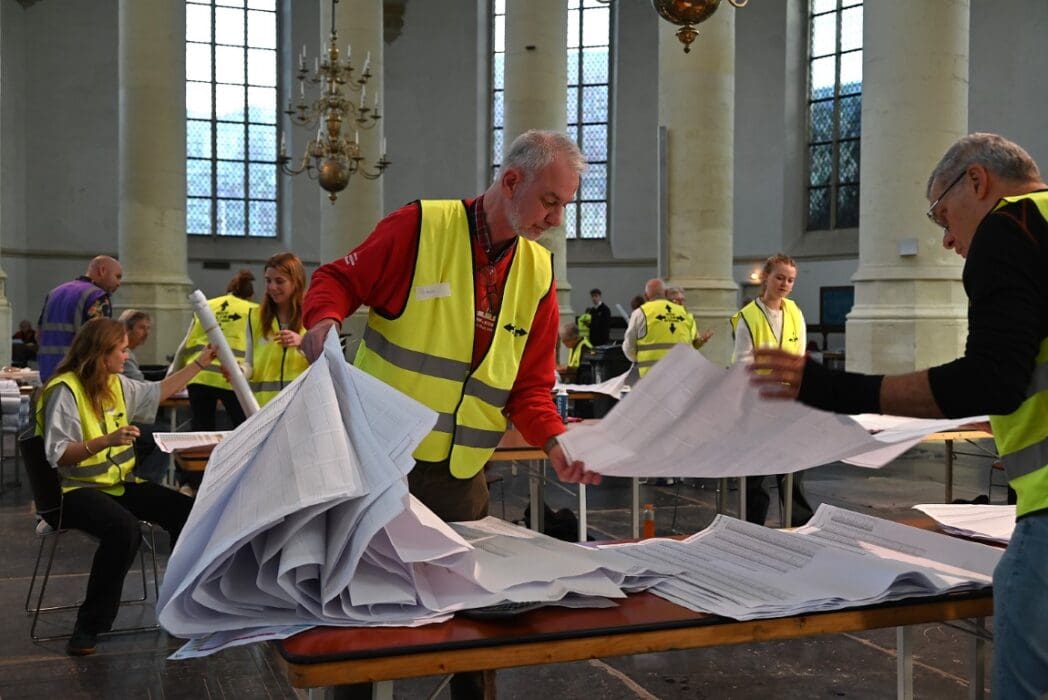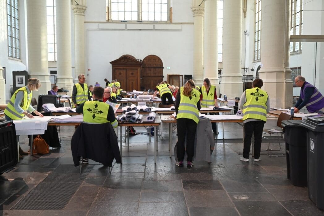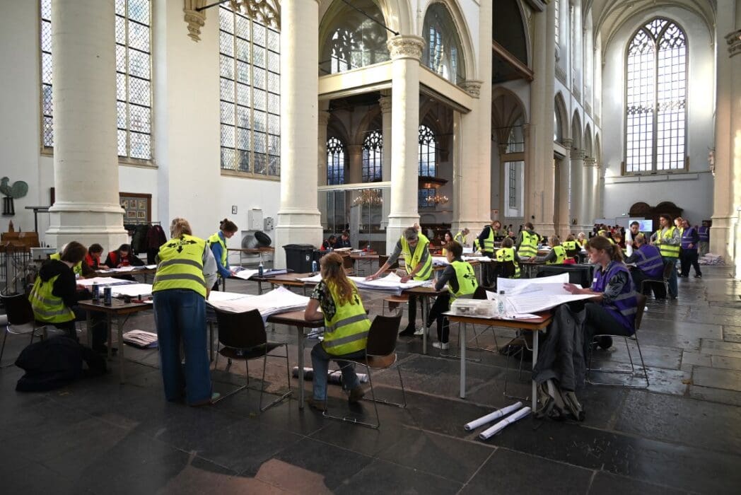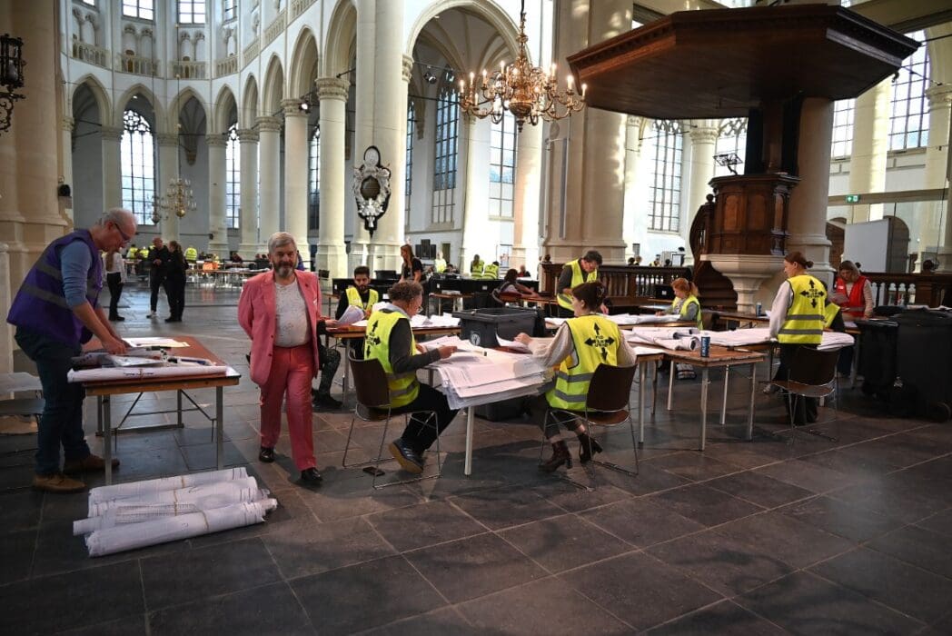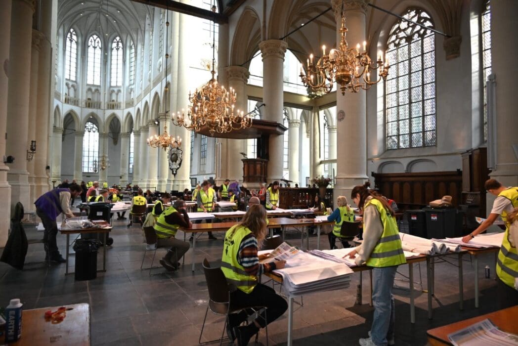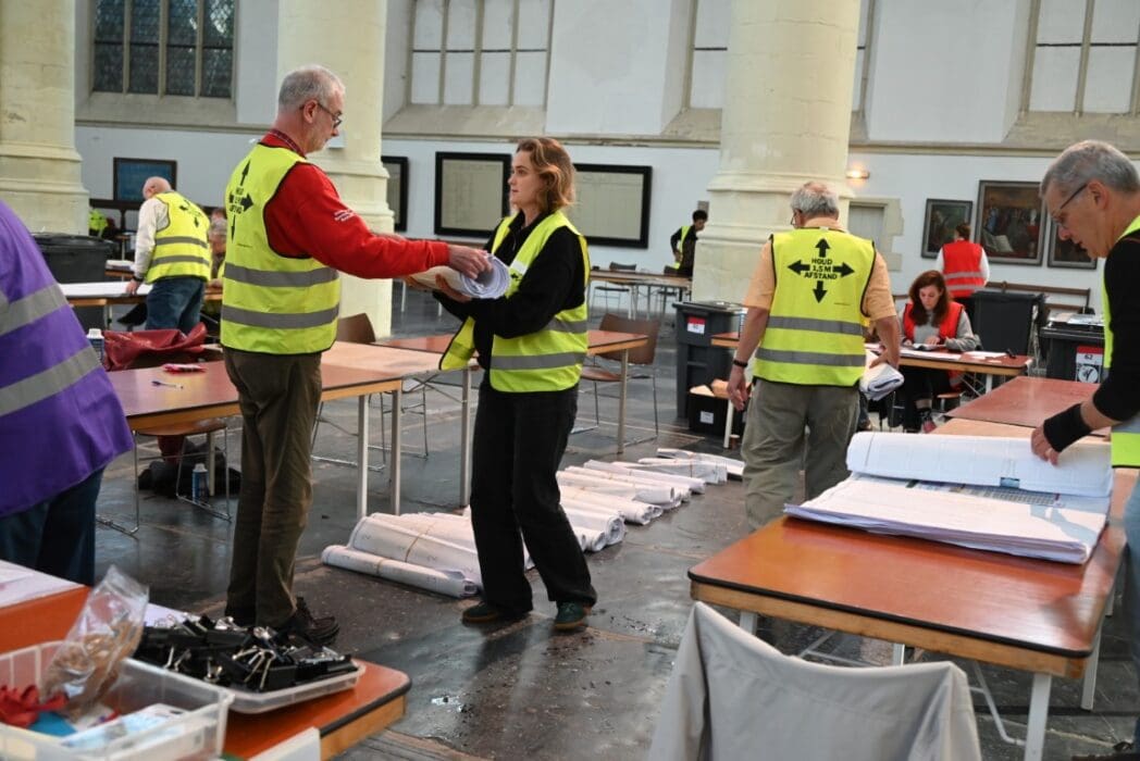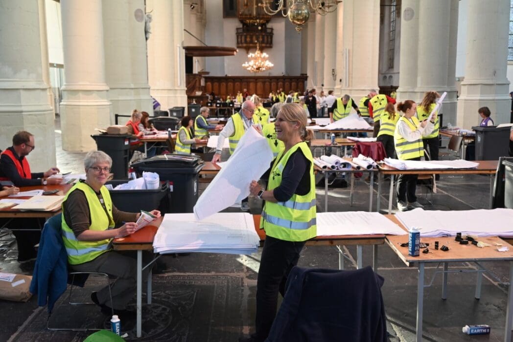 Het tellen van de stemmen is natuurlijk een behoorlijke klus en gebeurt in de verschillende stembureaus, maar het echte tellen is een dag later als alle voorkeurstemmen moeten worden geteld. In de Hooglandsekerk werden alle 77.912 in Leiden uitgebrachte stemformulieren stuk voor stuk opnieuw bekeken om de voorkeursstemmen te tellen.