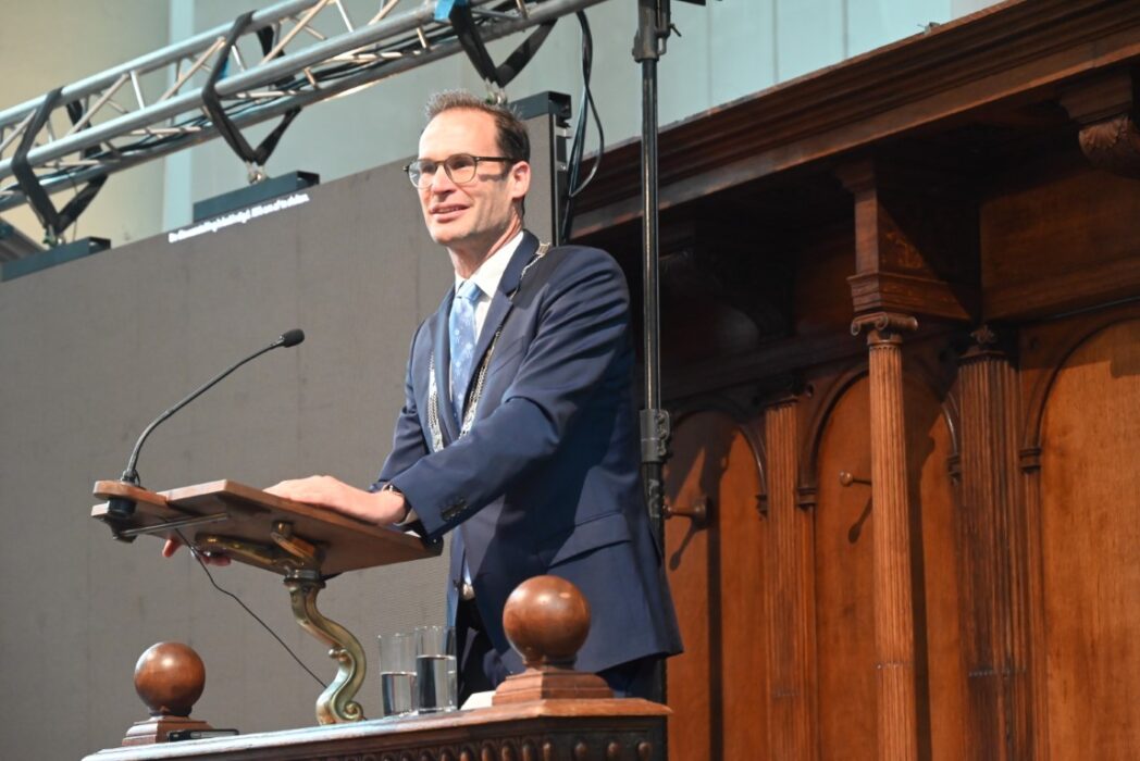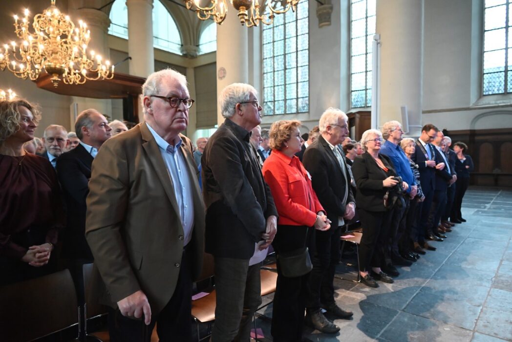 Uiteraard stond iedereen op voor het Leids Volkslied. Wie, net zoals ik, bij foto’s op details let ziet dat burgemeester Peter Heijkoop zijn jasje dichtknoopt voor het zingen van het Leids Volkslied.