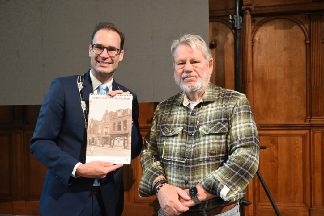 Ook kreeg hij een exemplaar van de Jaarkalender 2026 die als thema heeft “Leidse kroegen vroeger en nu”.