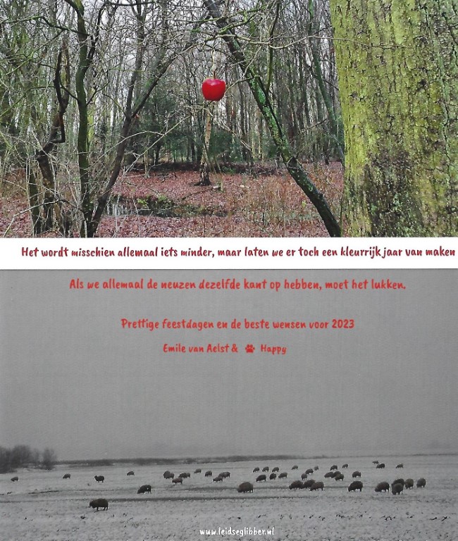 Ik maakte ooit ergens eind jaren zeventig ‘de fout’ zelf kerstkaarten te gaan maken voor vrienden, familie en bekenden. Eigenlijk deed ik het een beetje om me af te zetten tegen de gevestigde zoetsappige kerstkaarten die er toen waren. Ik begon met een stuk of veertig handgemaakte kaarten en later ontwierp ik ze wel maar liet ze drukken. In de loop der jaren groeide dat uit tot ruim 300 op zijn hoogtepunt. Momenteel zit ik nog op ruim 200 kaarten. Ik ben misschien/zeker weten nog van de oude stempel die het leuk vindt om de kaarten aan de muur te hangen. Aardig dat ik zoveel kaarten per mail of whats-app krijg, maar het leukste vind ik toch de echte kaarten per post.