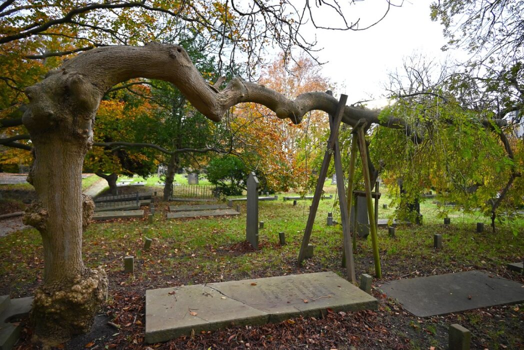 Er zijn nog veel meer mooie en of bijzondere bomen op de begraafplaats, je vraagt je af hoe het zo kan groeien.