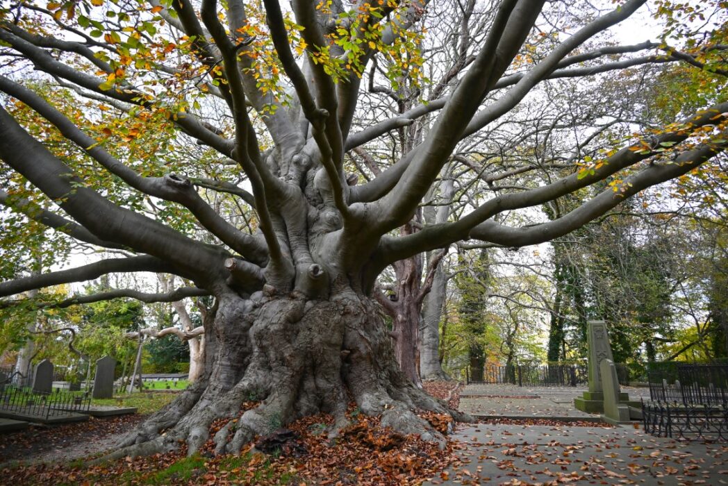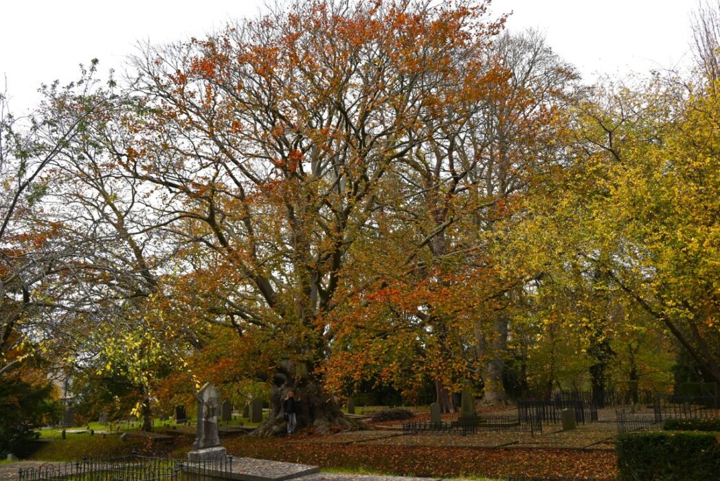 De grote Beuk op de begraafplaats kan je niet missen.